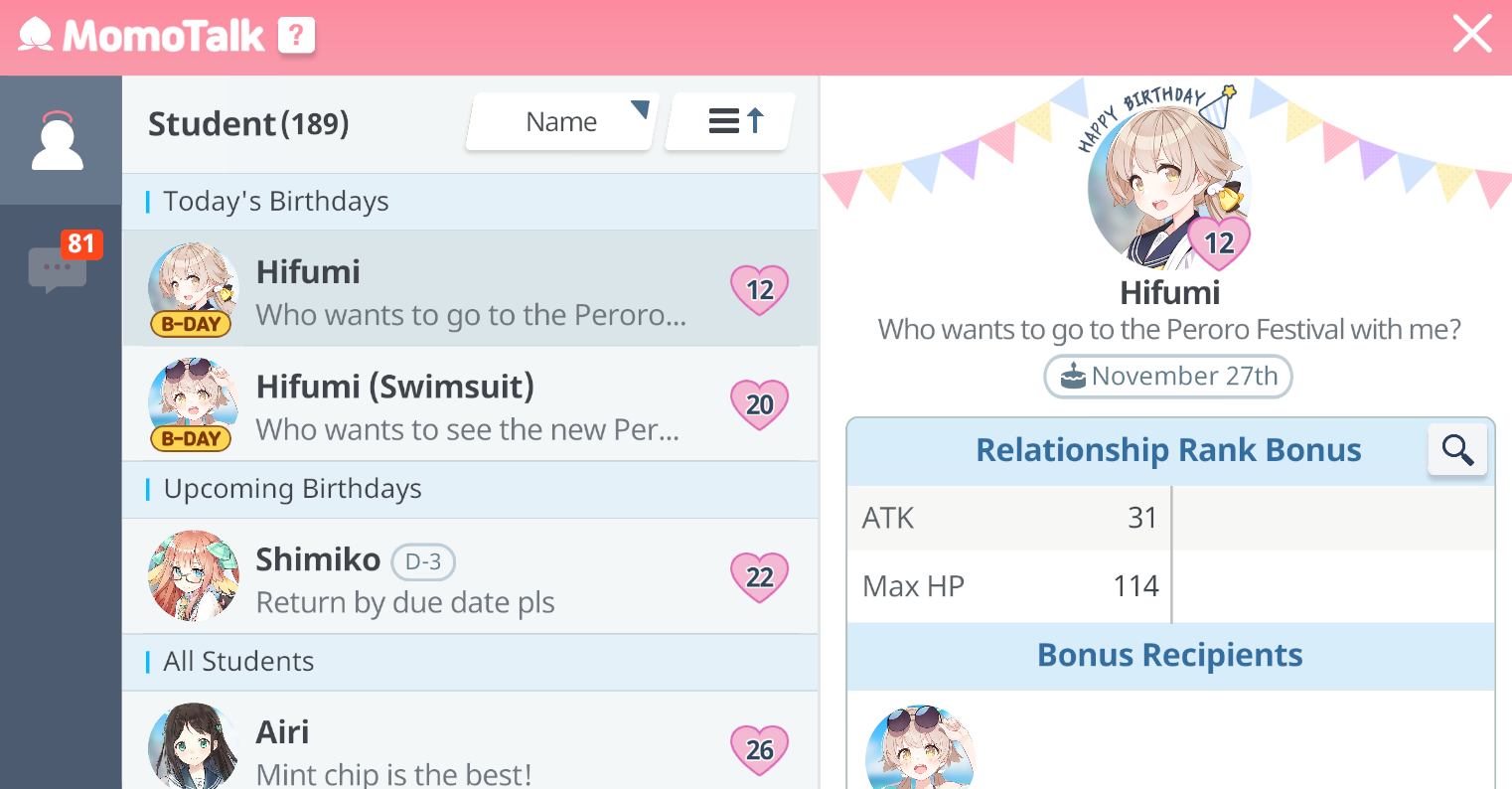 >>547974164>Casual Fuuka will be a nightmare to get up to 100 as well.Depends a lot on her favorite gifts, you might get lucky and get her to have somewhat different preferences than the other two