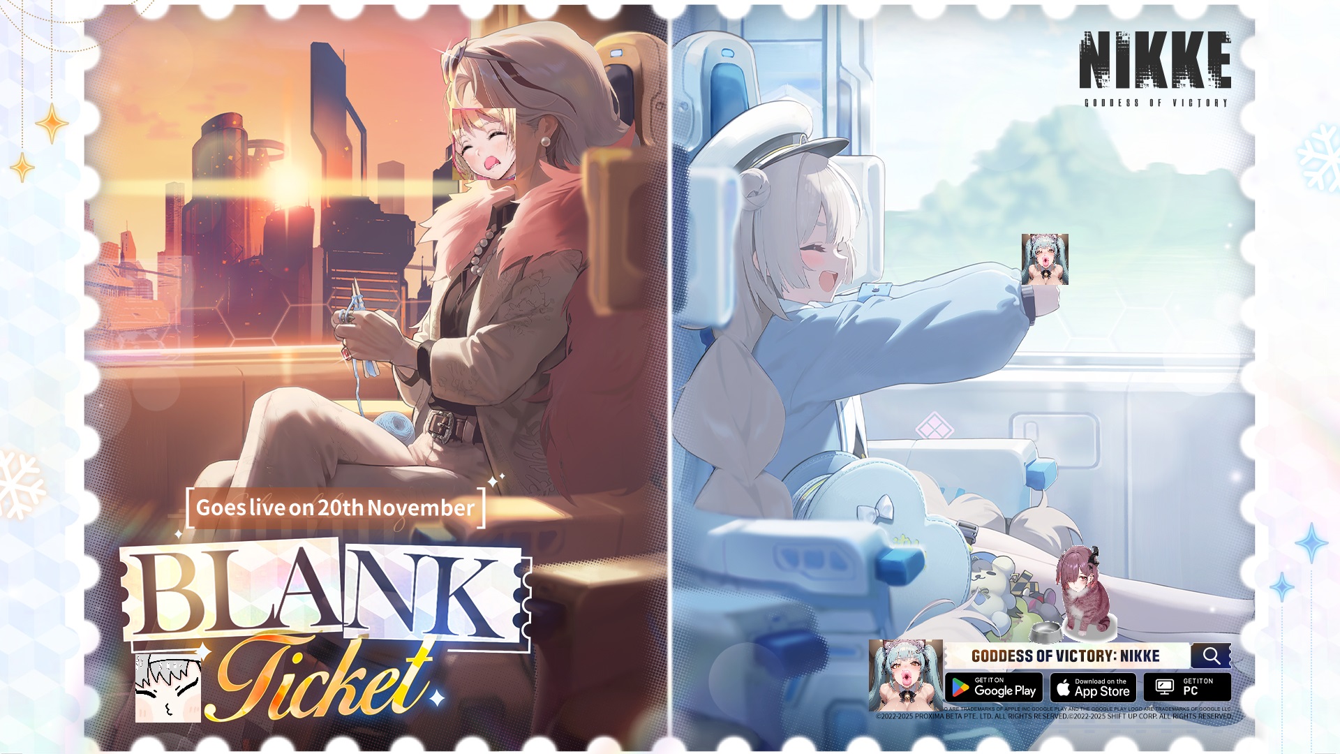 >Game Download - Android/iOS/PChttps://nikke-en.com/index.html>General Info/FAQ for New Playershttps://rentry.org/NikkeInfo>Additional Linkshttps://rentry.org/nikghomeALL DATES/TIMES LISTED BELOW ARE UTC+9 (KOREA TIME)>Update on November 20https://nikke-en.com/newsdetail.html?content_id=03e448baac511a47f3ab197ac163fb84de60>Developer's Note: September 2025https://nikke-en.com/newsdetail.html?content_id=c232f813ac34aa45c4aa3c1a8d6daec562db>Latest Developer QA interviewhttps://pastebin.com/M0E4MDUq>Current EventsBlank Ticket - Nov 20 ~ Dec 4TICKET CHECK (Login) - Nov 20 ~ Dec 4Rapi: Red Hood Special [Costume + OST + 5 Frames] - Oct 16 ~ Dec 4https://nikke-en.com/events/3rd-annual-report/index.html - Oct 13 ~ Oct 19>Upcoming EventsTBA>Current Special RecruitsLiberalio - Nov 6 ~ Nov 27Soline: Frost Ticket - Nov 20 ~ Dec 4>Upcoming Special RecruitsTBA>Current Costume PassesRapi: Red Hood (Cherished Red) [Event] - Oct 16 ~ Dec 4Nayuta: Wu Wei (Gacha) - Nov 6 ~ Nov 27Little Mermaid: Beautiful Bubble (Mission Pass 37)- Nov 1 ~ Nov 30>Upcoming CostumesJackal: Class Troublemaker (Mission Pass 38) - Dec 1 ~ Dec 31>codes3YEARSWITHCOMMANDERIAMNAYUTAPUNYQUEENGODDESSASSEMBLE3YEARSWITHNIKKENIKKEASSEMBLE3RDTHXFOR980000THXFOR990000Previous:>>547919213