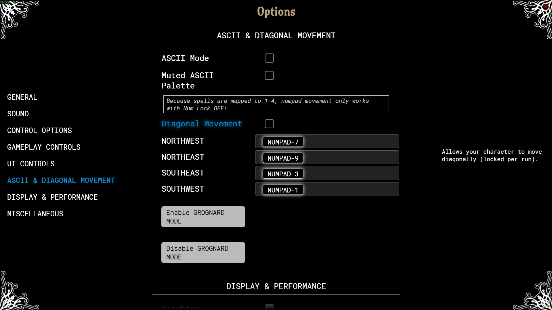 >diagonal movement>not on by default>"locked per run"I don't understand. Why wouldn't you want diagonal movement???
