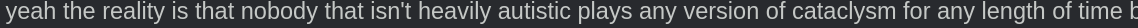 >>549861396yeah the reality is that nobody that isn't heavily autistic plays any version of cataclysm for any length of time because it takes almost nothing to realize it has absolutely no substance and any attempt to try to recreate the initial feeling of the game is temporary and takes more effort each time until you eventually just stop trying and give up on the game altogether, and then eventually just stop following the development as well.