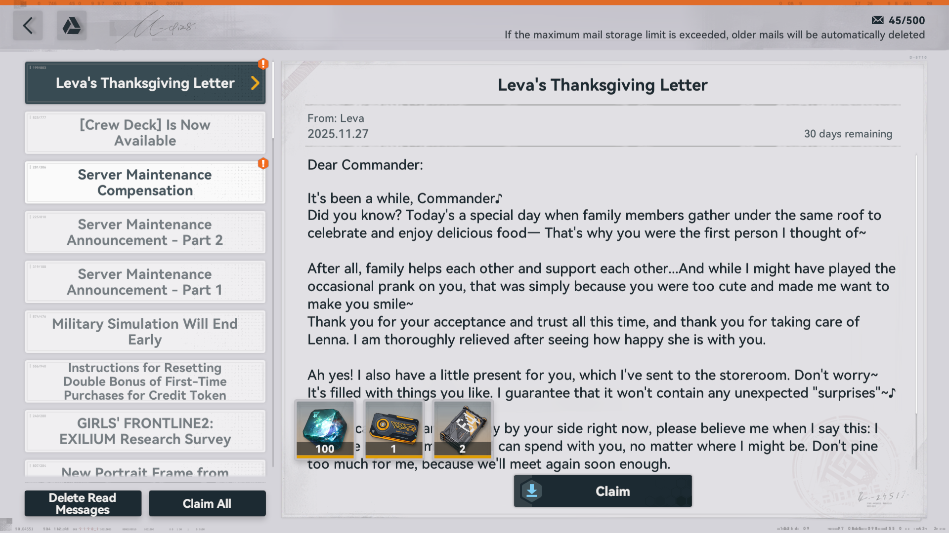 This is a thread for Girls' Frontline 2: Exilium, refer to /gfg/ for other MICA/Sunborn games.>[First Anniversary Major Update] Special Preview Programhttps://www.youtube.com/watch?v=9TOZxtepDSA>DARKWINTER SERVERhttps://gf2exilium.sunborngame.com/mainhttps://store.steampowered.com/app/3347400/GIRLS_FRONTLINE_2_EXILIUM/>HAOPLAY SERVERhttps://gf2.haoplay.com/en/https://store.steampowered.com/app/3308670/GIRLS_FRONTLINE_2_EXILIUM/>CURRENT/UPCOMING BANNERS AND EVENTShttps://pastebin.com/WReMZrek>RESOURCE COMPILATION (GUIDES, STORY, STICKERS, MODDING, ETC.)https://pastebin.com/xeYHpwtN>PLATOONS LISThttps://docs.google.com/spreadsheets/d/1hK9OFgo7MS-ONpvoek2H7UU5CaKq3lu5G2yqDPH5qtE>DO NOT REDEEMGFL2ANNIWYJACUUC9A (Expires Nov. 27)HF7RLVAKLM (Expires Nov. 27)NQJ2QGFTEM (Expires Nov. 27)Previous Thread: >>547915690