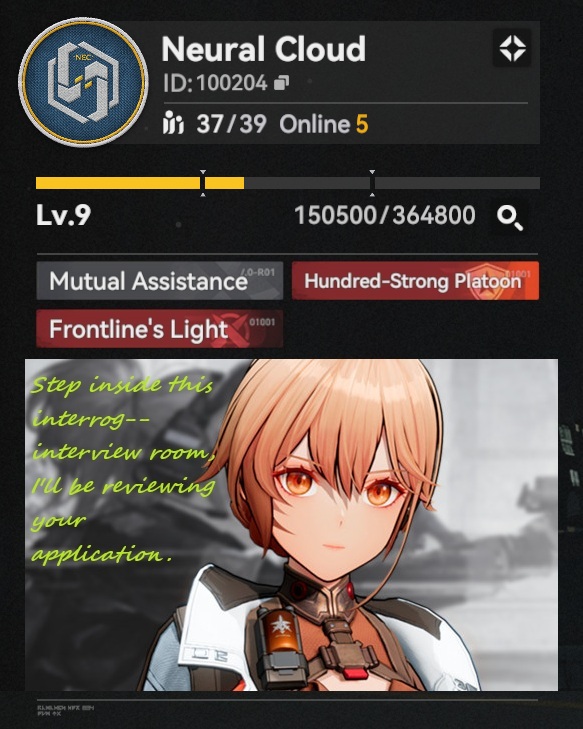 >>548005802Platoon ID 100204, Neural Cloud, Hao (Global)The year is 2025, you've survived the content drought, the doomscrolls, the negative whisperings in your ear and while the battlescars are visible, they're healing. You've endured and perhaps looking for some fellow individuals to revel with. If you're looking for a platoon, spots available for the yoink. If you're applying, please have something identifiable in your profile, tag the post or message in-game. I'm contactable if you have questions, UID 178728.New or existing players, no level requirement. Be active, do the dailies, participate in Gunsmoke when it's up and most importantly spend time on maintaining your dolls, that's all we ask. Active platoon chat and the usual V6 supports for your perusal. You didn't lie on your application submitted to Groza, did you?
