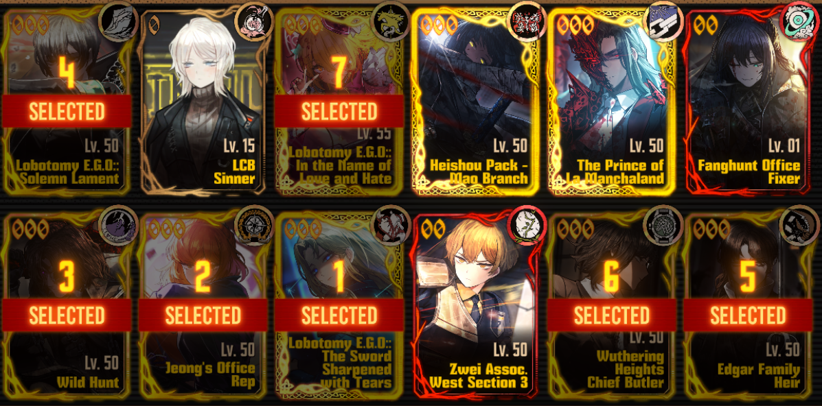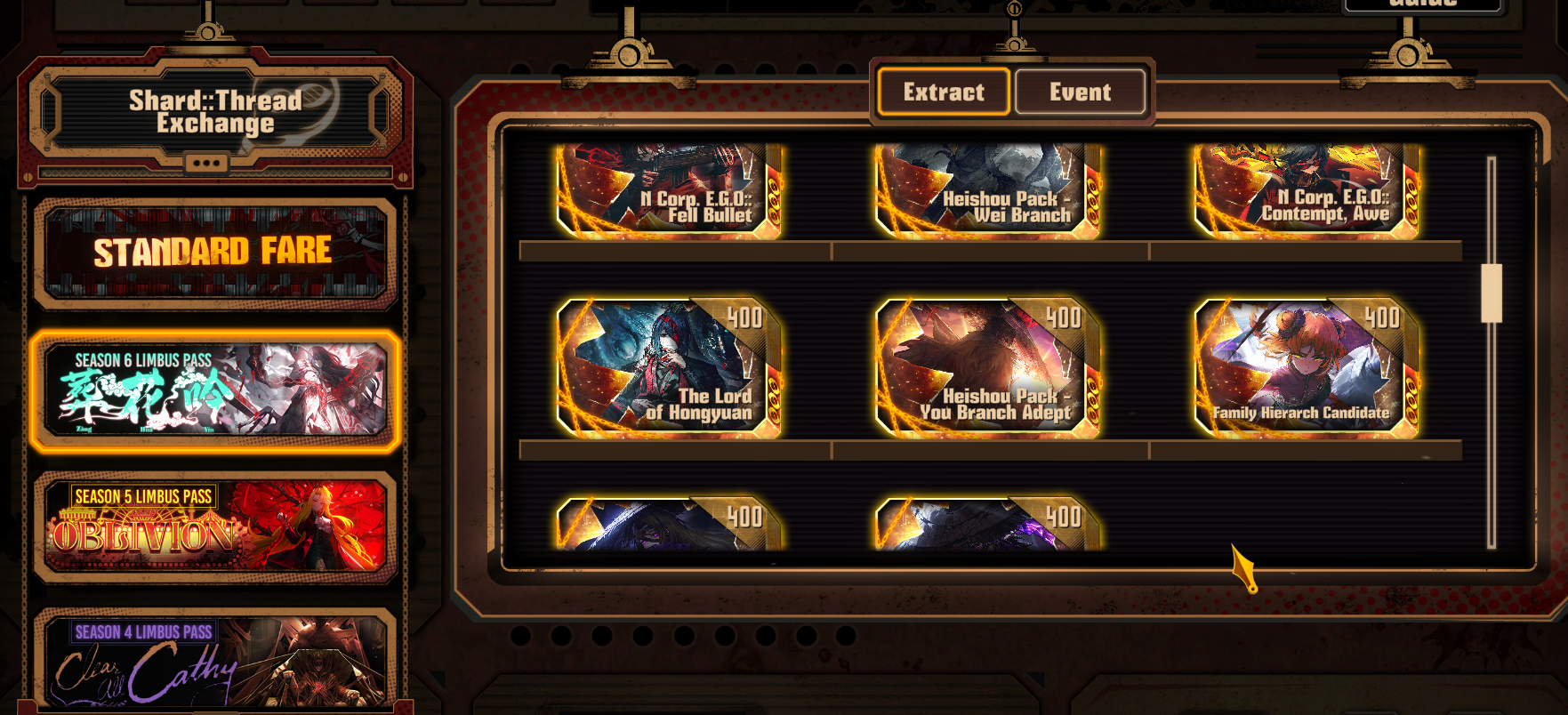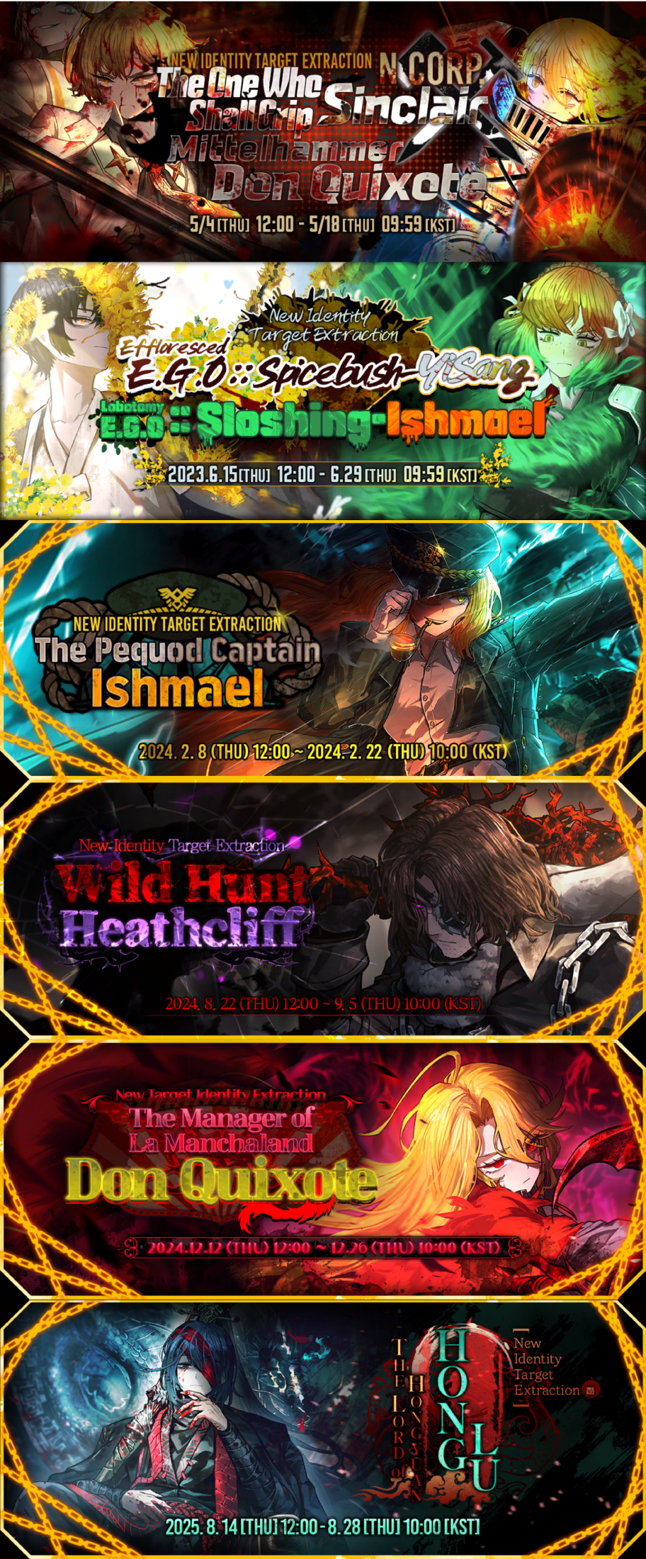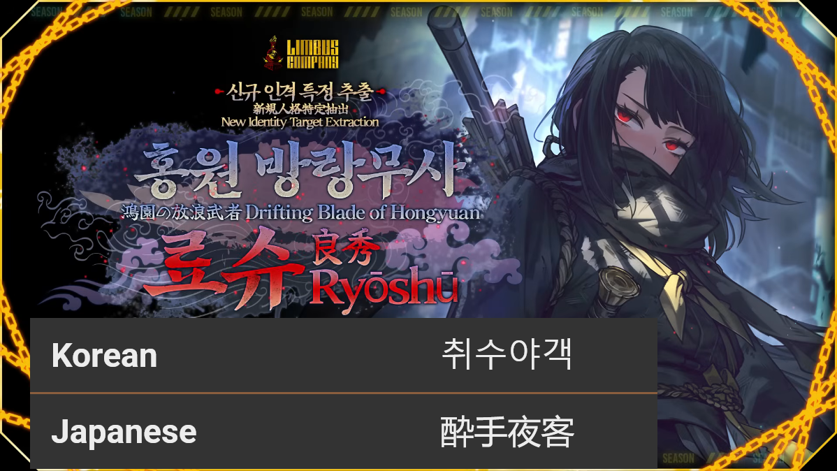 Previous thread:>>548035564Season 6 - 葬花吟 [Zàng Huā Yín]2025.05.15 —Season 7 - Kumo no Ito2025.Mirror Dungeon #6 - Mirror of Immortality2025.07.03 —Refraction Railway Line 5 - Merry Go Round2025.02.20 —Refraction Railway - LINE 1 MADNESS BOKGAK2025.11.20 —>Current Events>Current Extractions2025.11.20 — 2025.12.04[000] Heishou Pack - You Branch Adept Heathcliff[000] Heishou Pack - Wei Branch Don Quixote2025.11.20 — 2025.12.04Target Extraction: [ Hong Lu ] ID & E.G.O>FAQs! This game is directly tied to the setting of Project Moon's previous games, Lobotomy Corporation and Library of Ruina, and is set after both. Expect spoilers for those games in this thread.! The tutorial is important.>Download linksAppStore: https://apps.apple.com/app/limbus-company/id6444112366Google Play: https://play.google.com/store/apps/details?id=com.ProjectMoon.LimbusCompanySteam: https://store.steampowered.com/app/1973530/Limbus_Company/>Other linksOfficial twitter: https://twitter.com/limbuscompany_bOfficial youtube: https://www.youtube.com/@ProjectMoonOfficialOfficial site: https://limbuscompany.global>Required readinghttps://mega.nz/folder/xosDkZ5Z#Wt4JpUt5Bb2XG77pxuuXpw>For all your EGO and Sinner info needshttps://limbus.kusoge.xyz/https://gll-fun.com/en/>Useful resources and a general guidehttps://rentry.org/lcg_resourceshttps://rentry.org/lcbguidehttps://rentry.org/LCB_optimal_grind_guidehttps://lcb-days-since-last-id.carrd.co/https://lcb-days-since-last-ego.carrd.co/>Countdownhttps://lcbcountdown.carrd.co/
