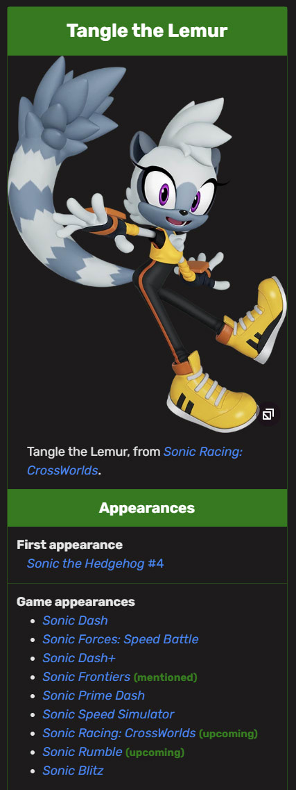 It's wild that she gets a render, Sonic Channel profile, CrossWorlds avatar, and gets included in Sonic Channel polls.