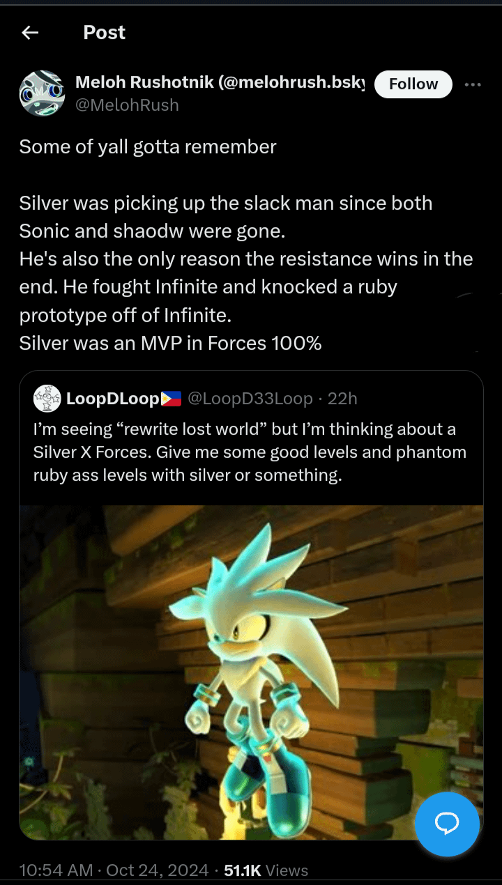 This. We just had a year of Shadow and Silverfags somehow took away "durr Silver just needs gameplay and voice acting and he'll be as popular as Shadow". It's complete nonsense. Shadow is remembered because of his relationships, story, and lore. Silverfags just can't cope that 06 and Silvaze was a hackjob and have to blame everything else but the conception.