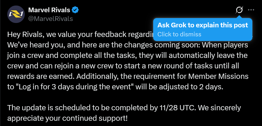 Version 20251120 Patch Notes: https://x.com/i/status/1991190015490023628