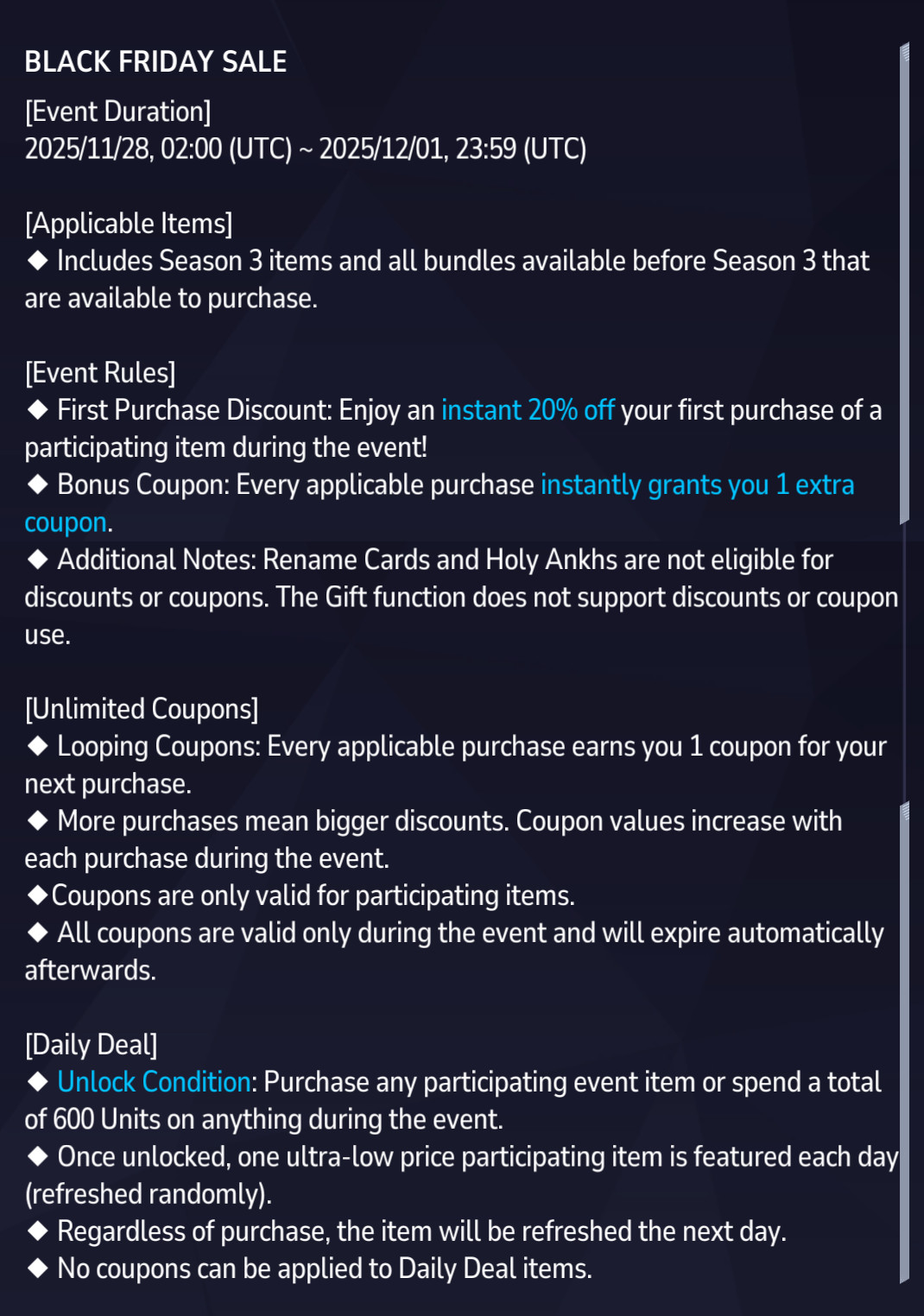 I'm curious to see what they actually do with the black friday sale. I'm sitting on a bunch of units because they rarely release skins I like so maybe the cheaper ones might get me to buy