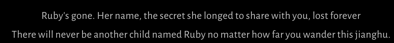 >>548150472You were trapped in an illusion that always led you back towards Blissful Retreat, in order to stop anyone from escaping. Ruby slipped outside of the illusion using a route only she cold squeeze through, to provide you with an anchor point beyond the illusion that would prevent the disorientation and allow you to escape.>>548150684You know that grave where she waved the flag? Go dig it up, I guess. Who knows, everyone thinks the Young Master is dead for some reason, so maybe Ruby faked her death and the grave is empty? Personally, I believe she is dead.How the fuck does Jin, a guy we barely knew recognise use, and yet all the peeps in Heaven's Pier are all "you look similar to the late Young Master..."