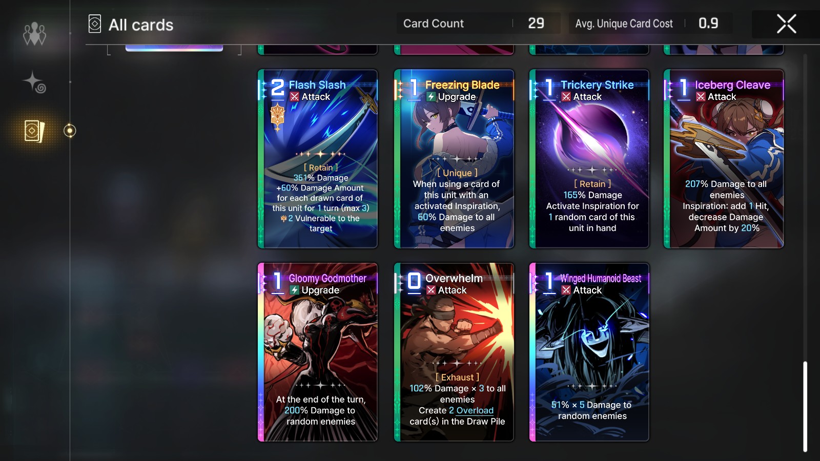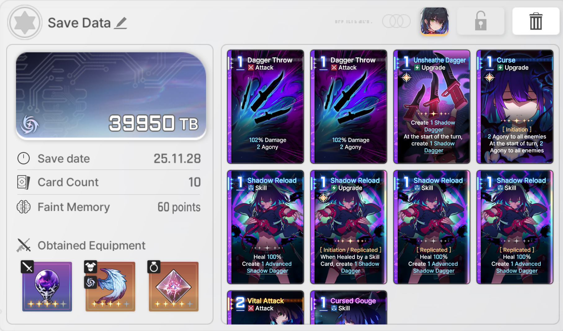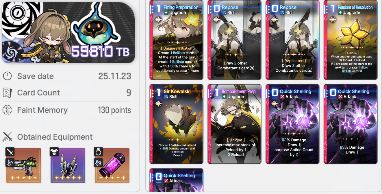 >>548217162There aren't many guides yet, but you should check the purple items from each planet. Characters can only carry one purple equipment. Many are memes but some are incredibly strong. A few notable purples:>Fragment of the empty void (city of mist/lab 0)Discard up to three cards at start of the battle, draw the same amount. Stacks if you have multiples.>Verdant Shackles (swamp of judgment) Pulsating egg (twin star)Just nice stat buffs if you have no other ideas>Foggy crystal ball (city of mist/lab 0)0 cost cards get 40% more damage>Chimeranite (lab 0)35% attack card damage if you draw with an abilityThe deep trauma Cthulhu enemy can also drop some useful mythics if you kill it too. In particular, it has a support weapon that gives your allies 8% attack and an accesory that gives +1 AP +1 draw at start of battle. You should also try to clear the event, which means building decks only in Lab 0 so you can use those decks to fight bosses (you want to beat difficulty 6 at least) as well as weekly runs until you get the cap the weekly event currency income boost from it.