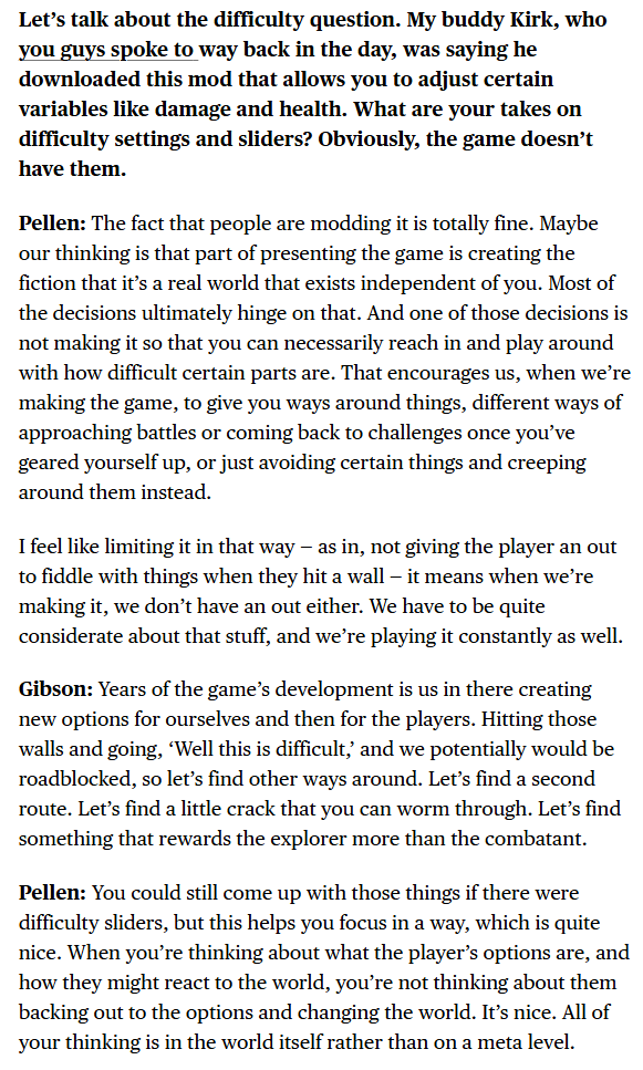 >>548208182>>548208619>Gibson: No, that’s exactly how it’s meant to present. You’re not meant to necessarily realize there’s an Act 3. Some players will naturally encounter Act 3, and the players that will encounter that are the ones who will likely have played in a very completionist way. The players who really spent the time to help all the creatures in the world, befriend everyone, and also have spent time exploring the extents of the kingdom. It has that natural gate of someone who’s shown themselves to be an exceptional explorer, an exceptional combatant. They’ll have this new chunk exposed to them. For other players they can comfortably come to an ending that is ambiguous as to whether it’s a good or bad ending. It is just an ending.So all the people making headcanons about the Weaver Queen ending got vindicated at least.