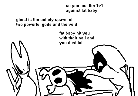 >realizing they're gonna make us fight Trobbio a third timeThey should pull a Nightreign and make a PvP game. Unique/personalized bugs, random maps from Silksong. But go full The Duskbloods and lock the center area until the opposing players complete gauntlets for random tools.