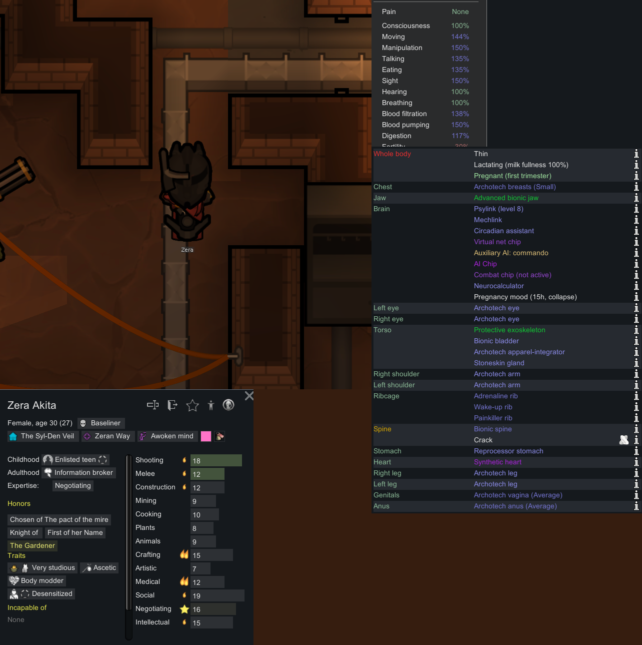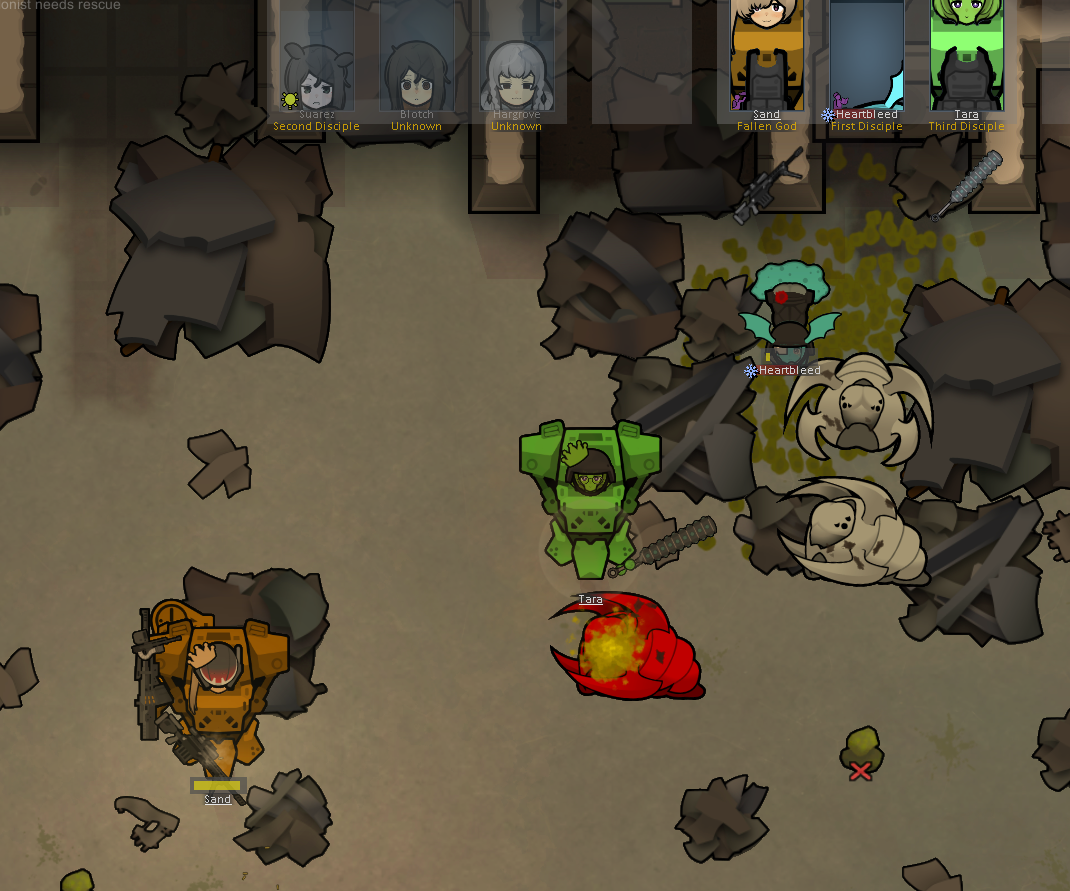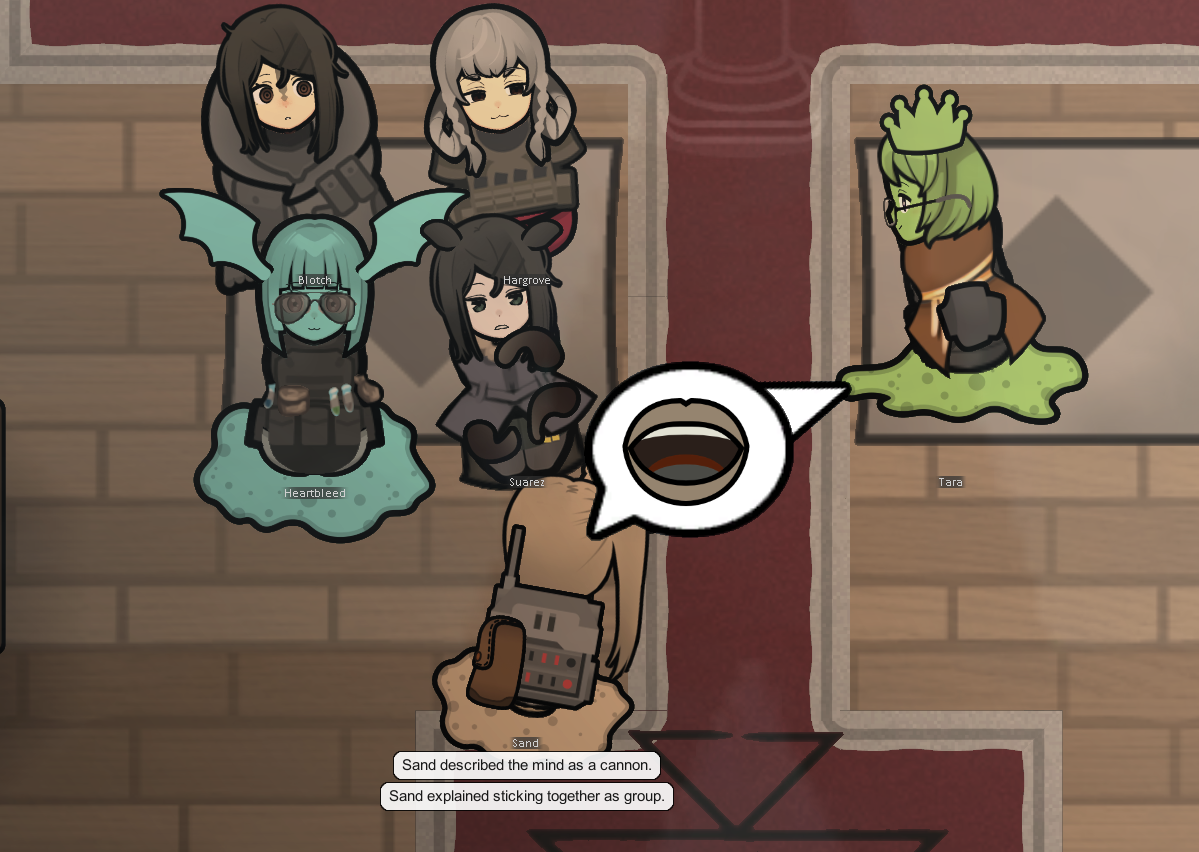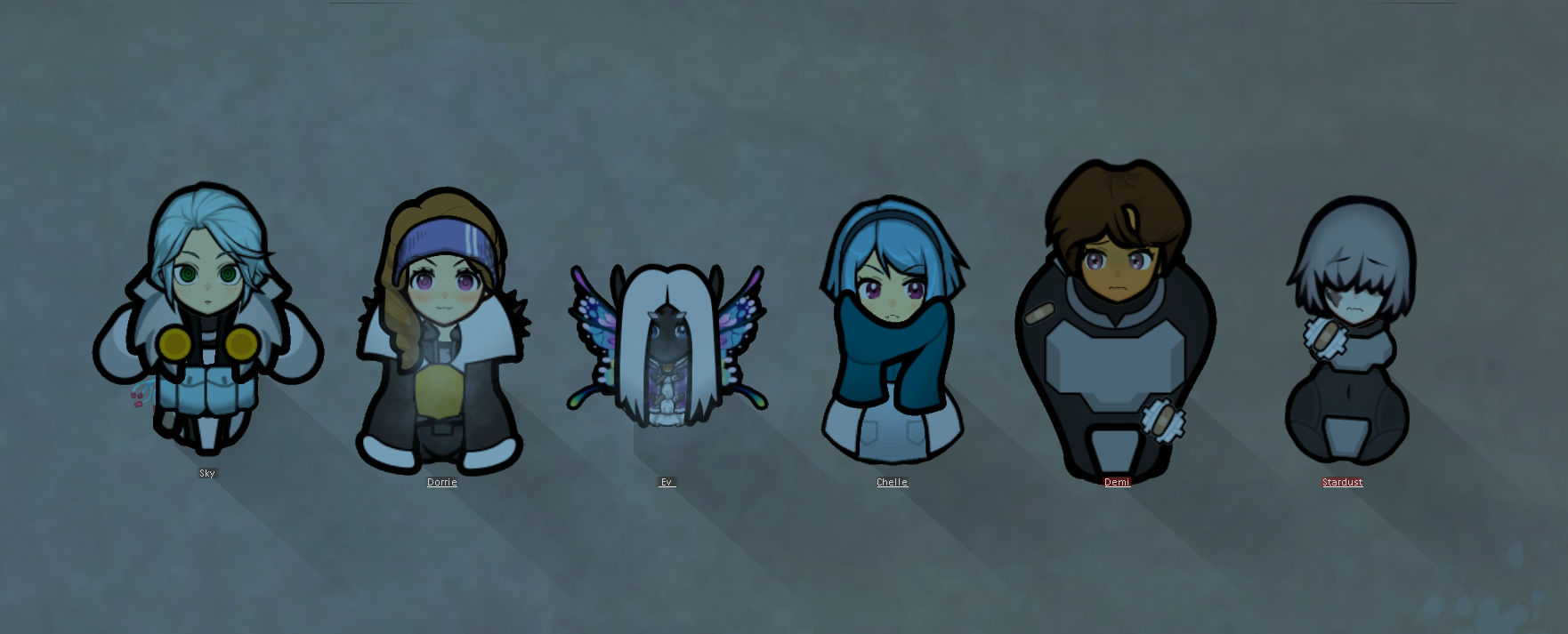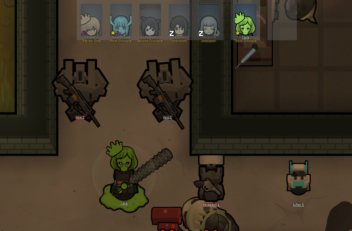 My two starting characters of the only run that I actually saw to the end, Luna couldn't pick just one struggle, as she was already a psychically enhanced melee battle maniac, but after she was voidtouched and Sanguophaged, she became a one Maru army.