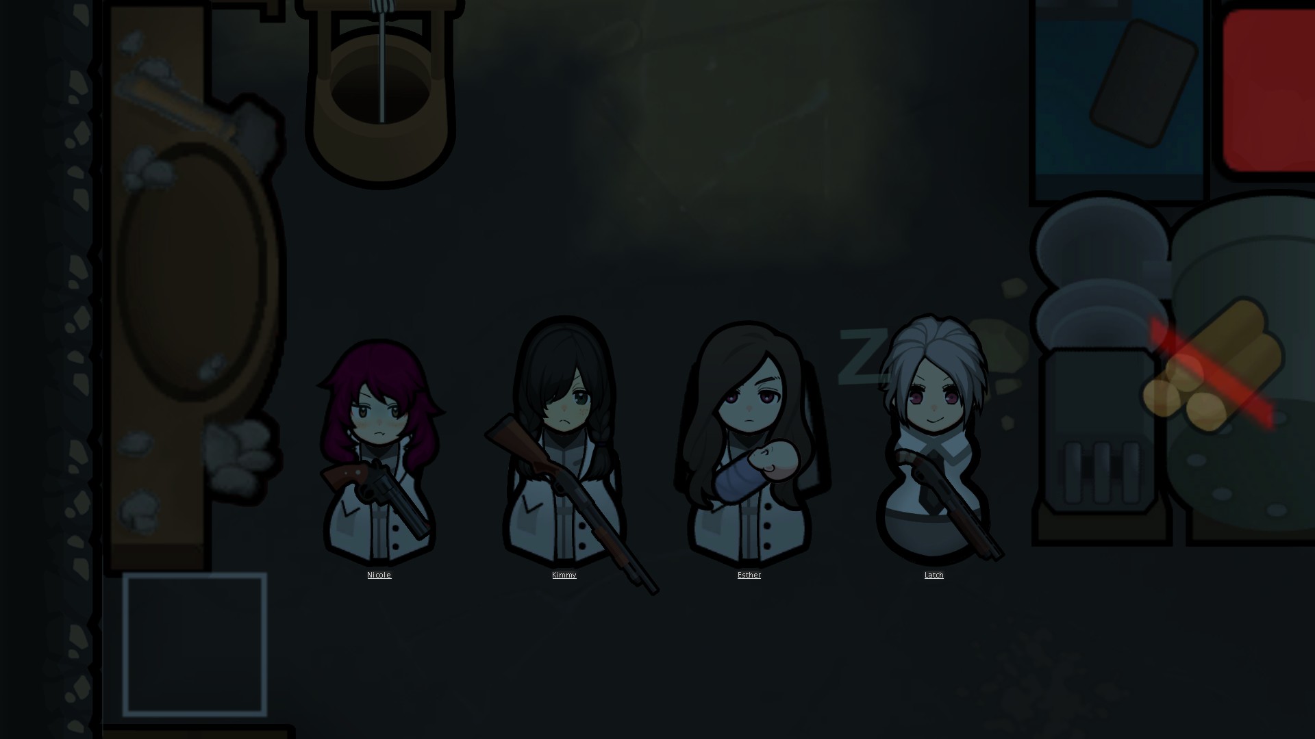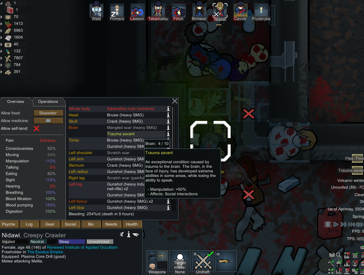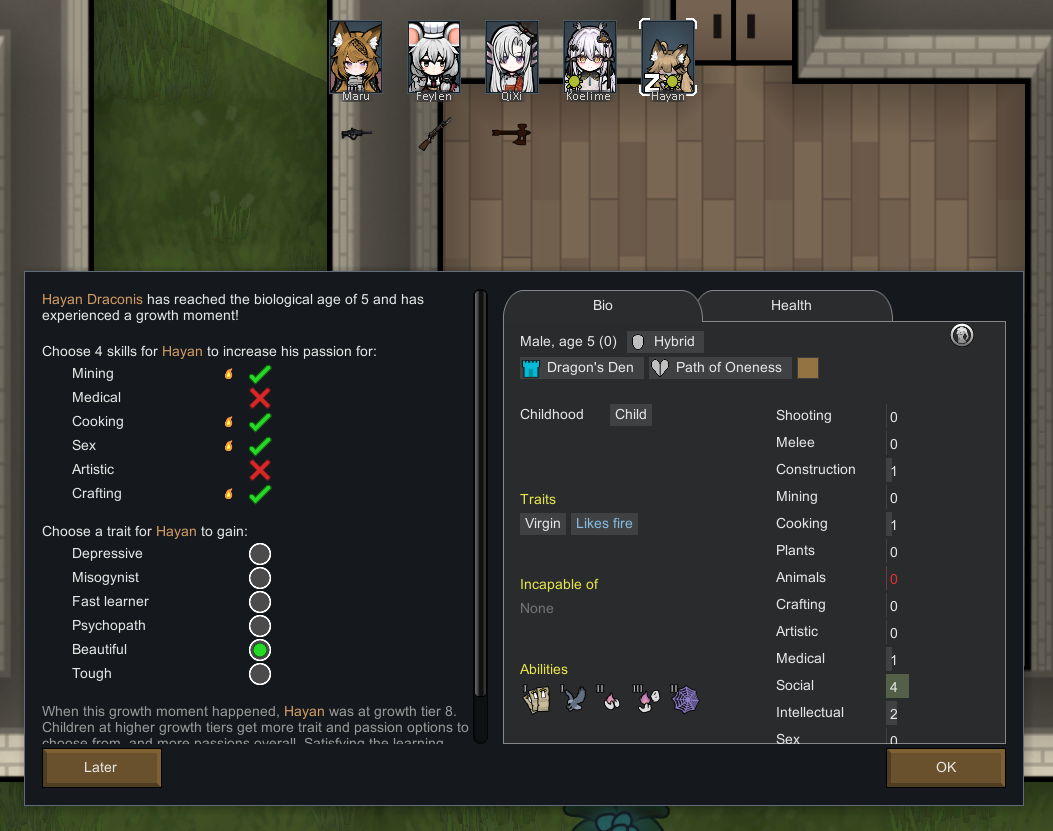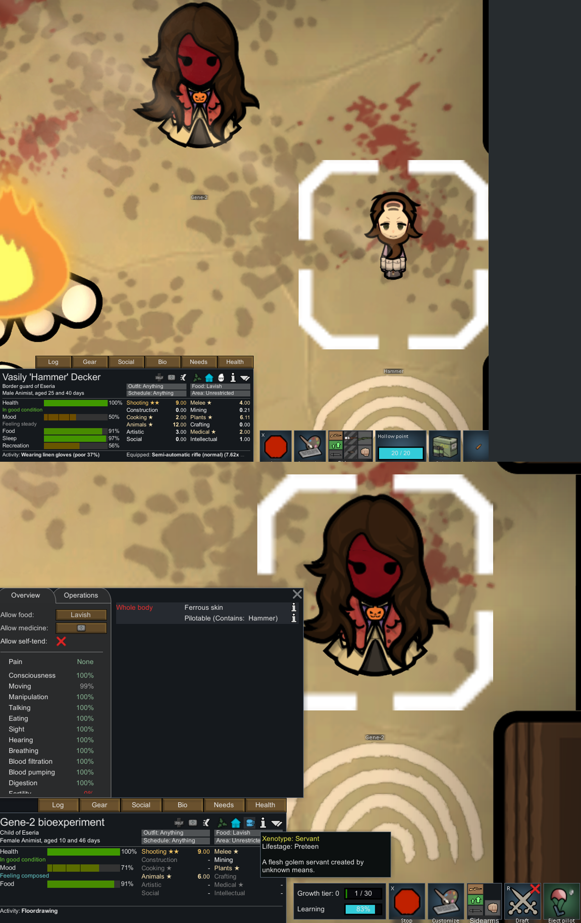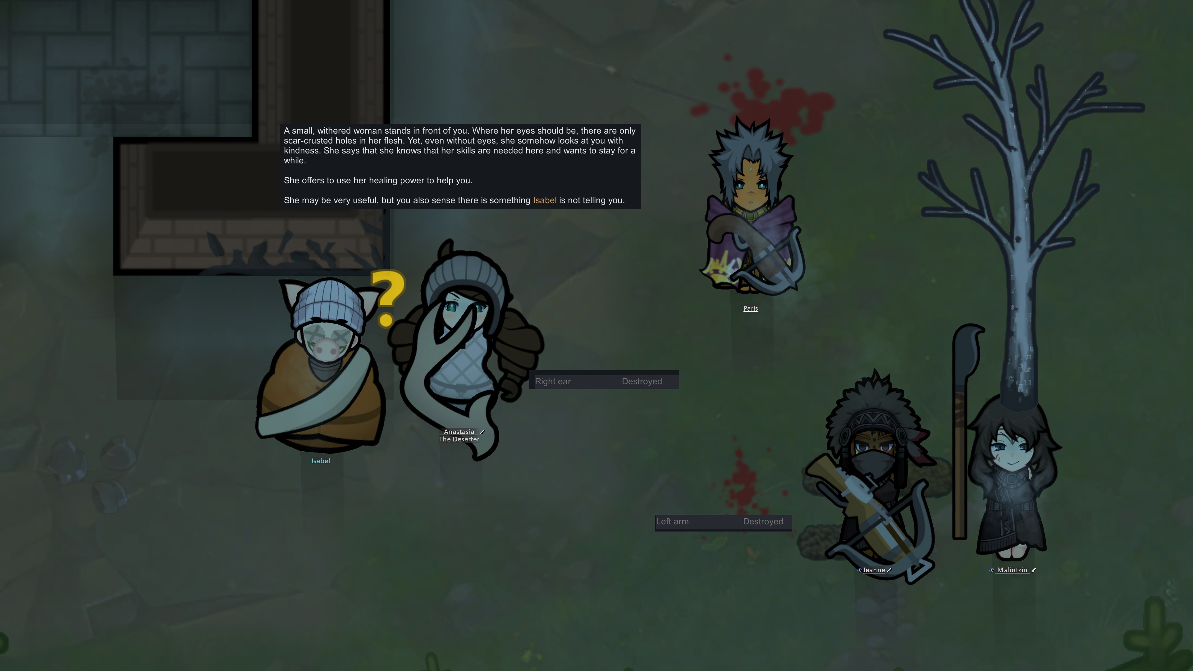 My two starting characters of the only run that I actually saw to the end, Luna couldn't pick just one struggle, as she was already a psychically enhanced melee battle maniac, but after she was voidtouched and Sanguophaged, she became a one Maru army.