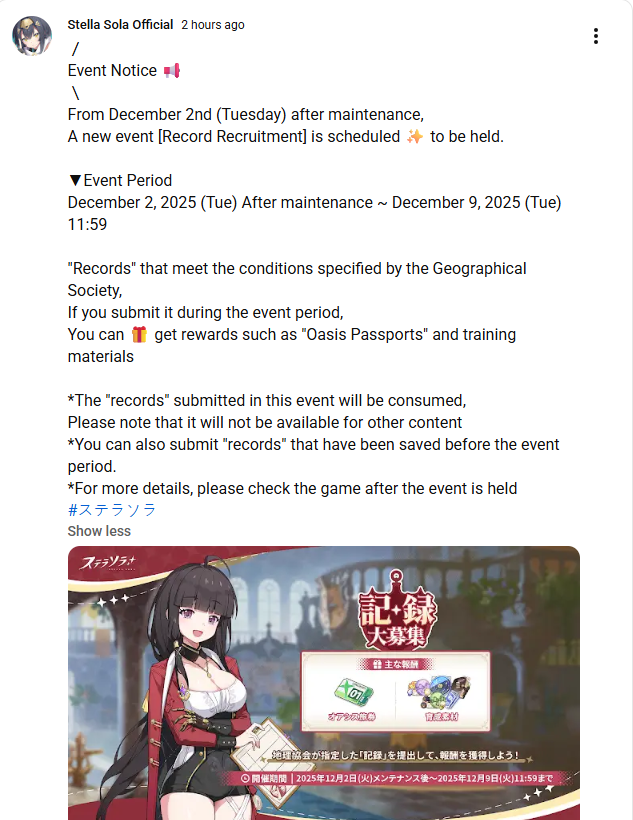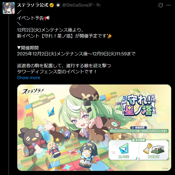 Previous Commission: >>547988743>Game Website & Downloadhttps://stellasora.global/>JP Clienthttps://stellasora.jp/>Current Content[11/17] Main Story Chapter 3 Release[11/17-12/08] Limited Recruit - (Ignis) 5* Fuyuka + (Ignis) 4* Flora and (Ventus) 4* Canace[11/17-12/08] Disc Pickup - (Ignis) 5* "Fireworks Dazzling the Night"[11/17-12/01] Main Story Event - Guild Sweet Guild[11/17-12/08] Paid Skin - Nanoha[11/17-12/08] Cataclysm Survivor - Catastrophe (Element: Ignis+Lux+Aqua)[11/10-12/01] Limited Recruit - (Ventus) 5* Nanoha + (Lux) 4* Tilia and (Ignis) 4* Kasimira[11/10-12/01] Disc Pickup - (Ventus) 5* "Daylight Garden"[10/27-11/27] Login Event - Wind, Wave, Wild Adventure>Upcoming Content[11/30-12/30] Boss Blitz - Ventus+Lux and Ignis+Aqua[11/30-12/30] BP Skin - Tilia[12/01-12/08] Limited Event - Chess Defense[12/01-12/08] Limited Event - Call for Best Records[12/01-12/22] Limited Recruit - (Terra) 5* Gerie + (Ignis) 4* Flora and (Ventus) 4* Canace[12/01-12/22] Disc Pickup - (Terra) 5* "The Lost Pilgrim"[12/01] New Nova Times Chapters>Wikihttps://novasora.wiki/>Resources and useful linkshttps://rentry.org/StellaSoraResourceshttps://rentry.org/StellaTierListshttps://rentry.org/StellaSoraBuildshttps://rentry.org/StellaSoraAscensionGuide>CodesBOSSGIFT