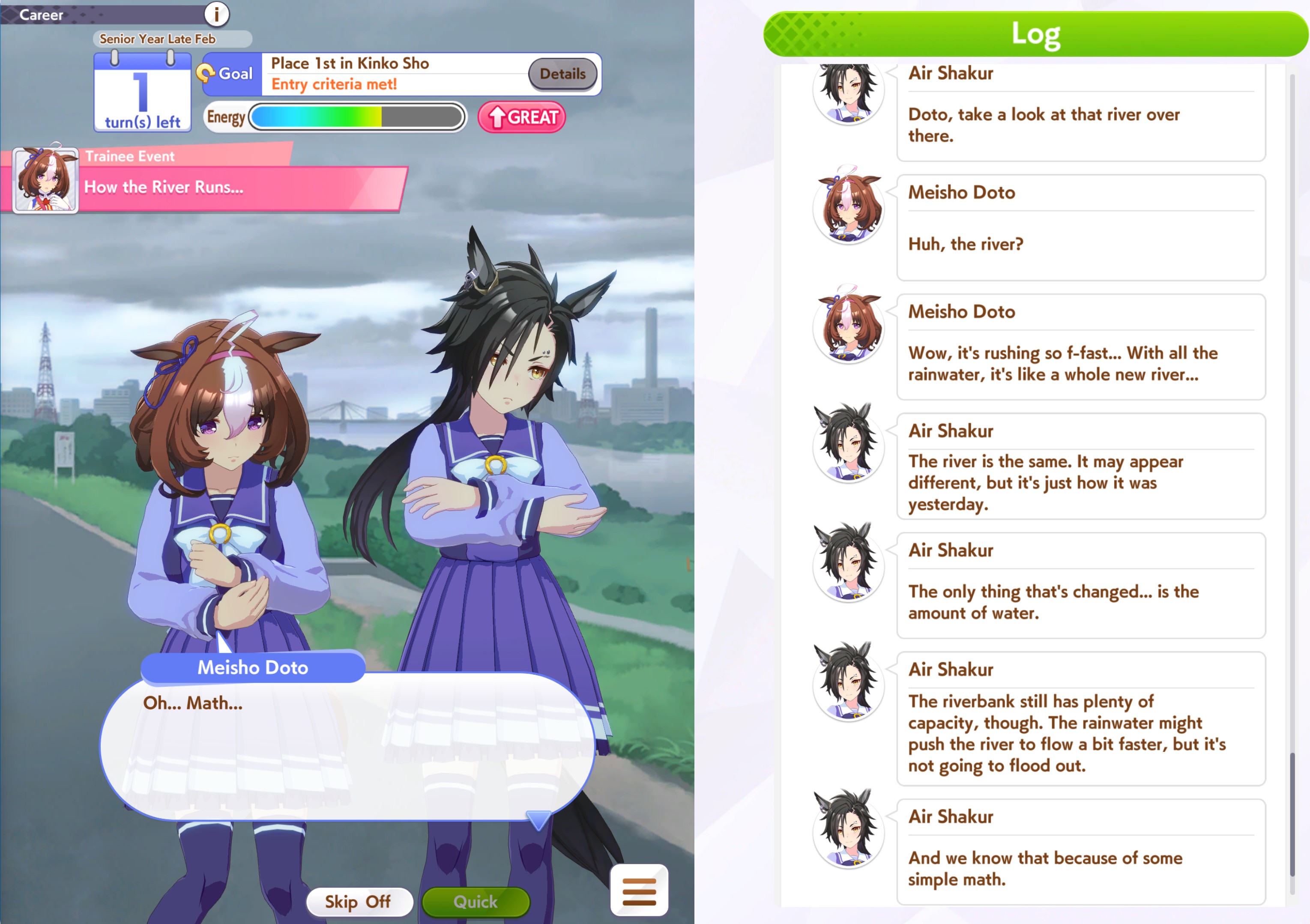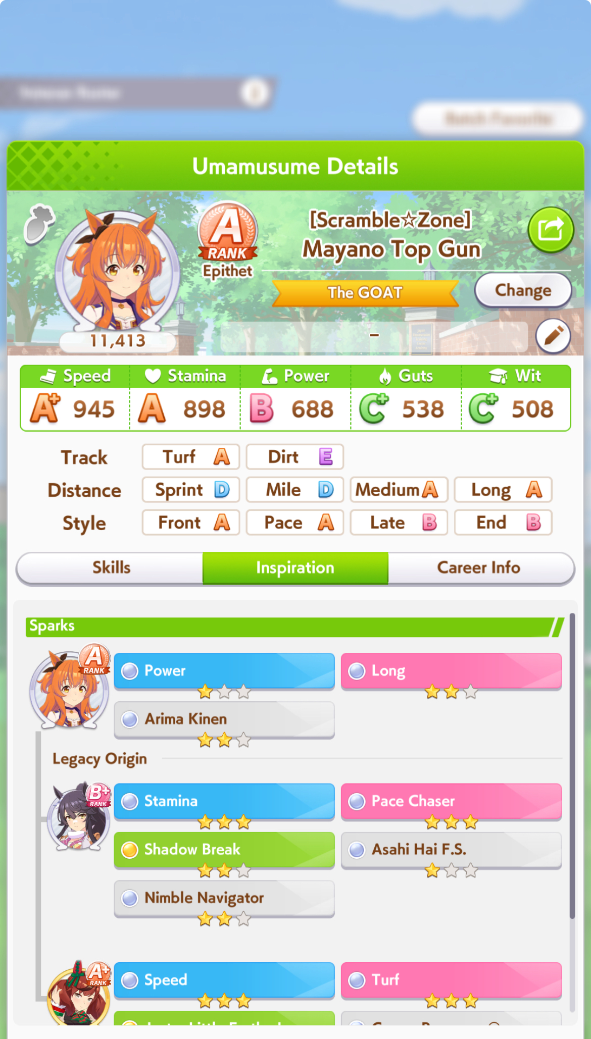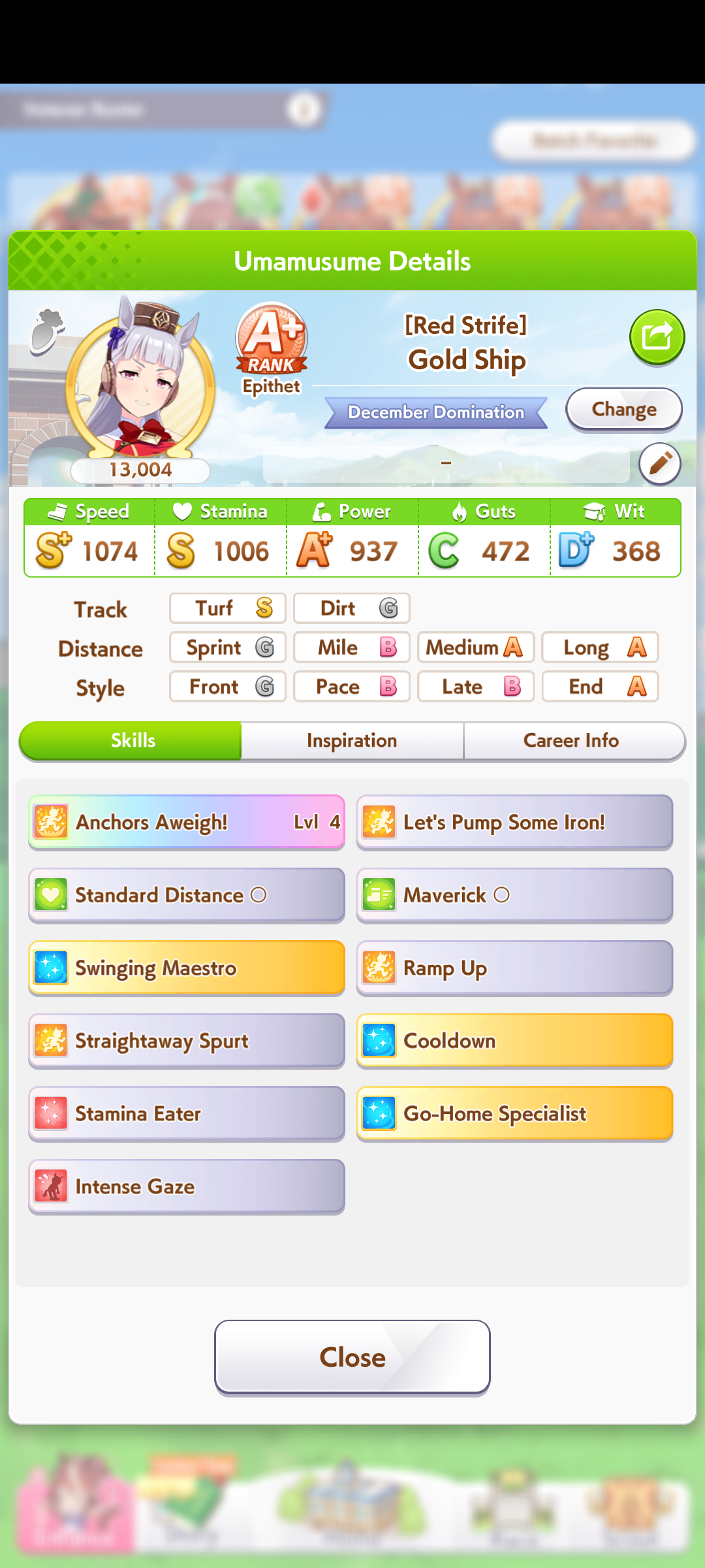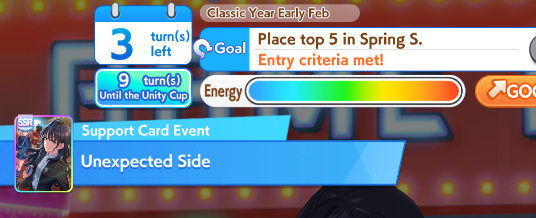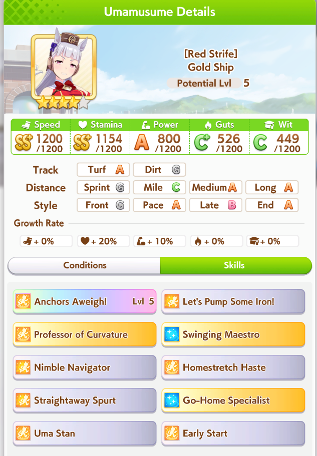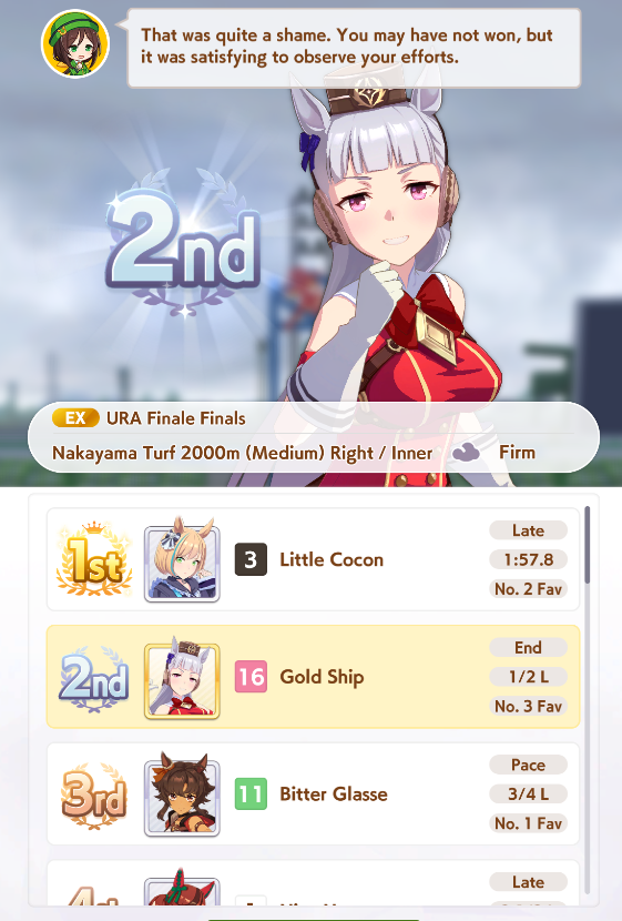 Pro-tip: Uma-stan will pace down you if there's no front runners. If the CM turns out to be little front runners with little accels then getting uma stan on goldship is a bad idea.