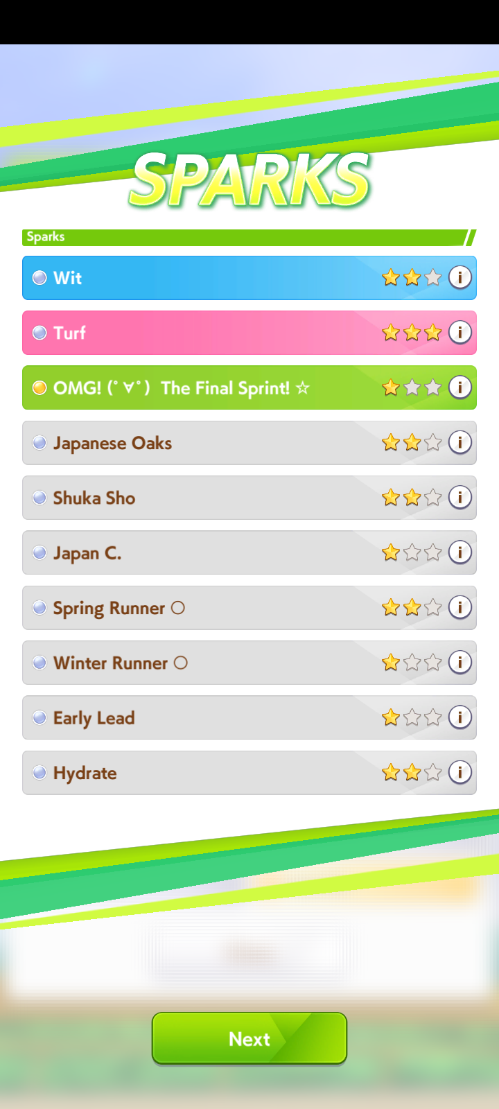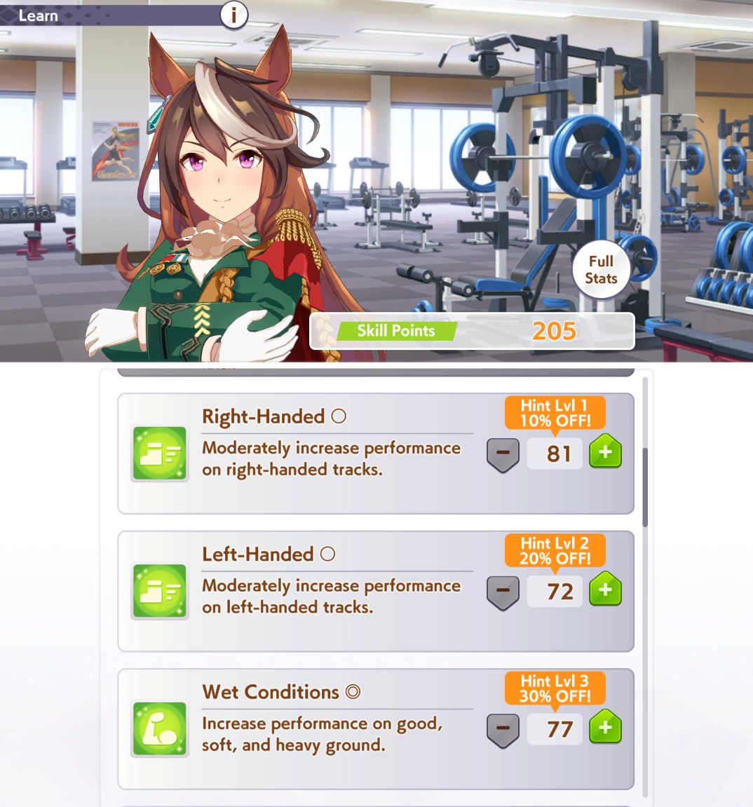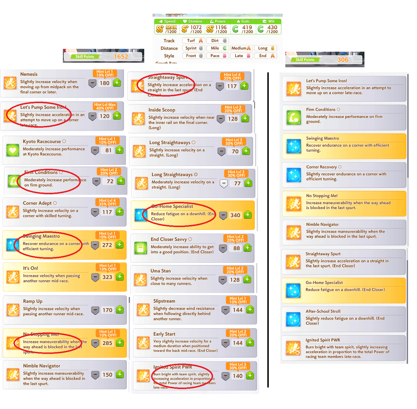 Can you guys help me choosing golshi skills? thanks in advanceStat is about 1100/1050/800/450/400 with long S992 points remain, 2 gold recovery already boughtEmperor might - 180Trium pulse - 160Non dis - 81Firm - 72Corner/Prof - 108/270Ramp up/It's on - 170/323Nimble/NSM - 150/285Standing by - 108Straight spurt - 117Inside scoop - 128Flustered front - 117Flustered late - 91Stam eater - 128Umastan - 160Early start - 144Ignite SPD - 140
