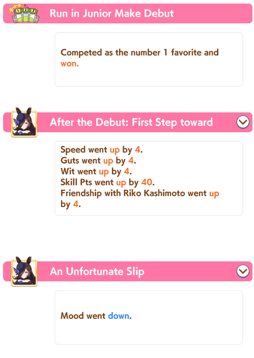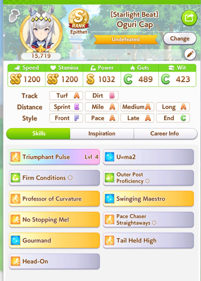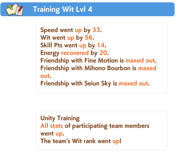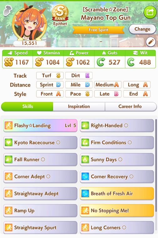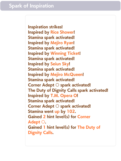 >>548263417>release uma's unique skillIf you're in the front on the final corner, gain additional speed.>also comes with Cooldown and Speed Star in Potential>year 4 uma's unique skillIf you're in the front on the second half of the race, gain additional speed; or if you're well-positioned in the final corner in Nakayama Race course during summer and on wet turf and about to overtake someone and about to be overtaken, greatly increase speed and acceleration>also comes with Swinging Maestro and In Body and Mind as Potential and has upgraded version of In Body and Mind that also increases acceleration