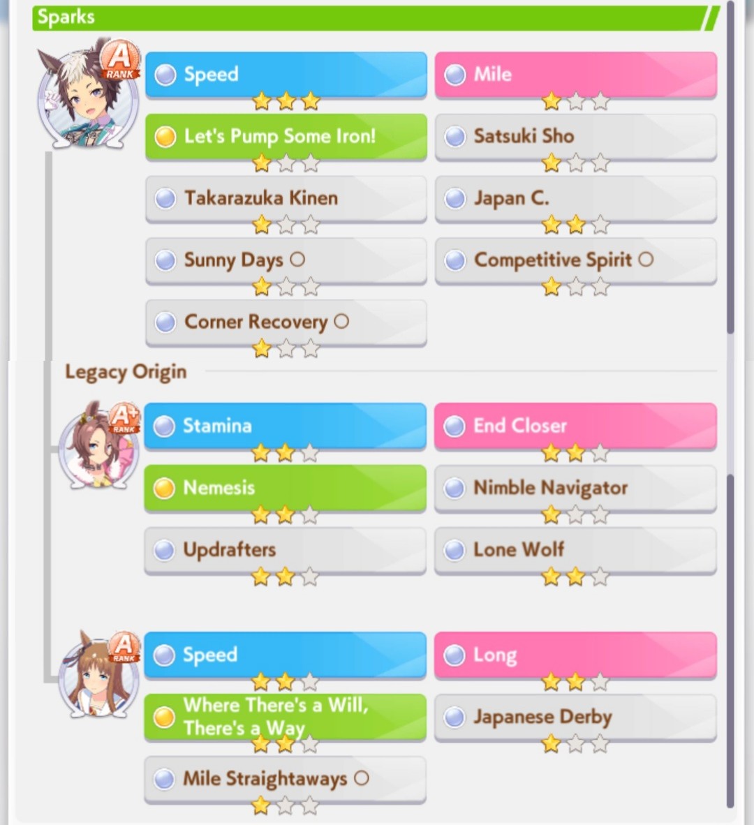 With how quickly CMs have been happening, I haven't intentionally spark farmed in a long time. The anniversary update really screwed over making parents, didn't it? Getting the important epitaphs was always a bit RNG but you just can't statcheck your way through. difficult pronunciation uma always gets fucked on one of 'em. And my god is it demoralizing to win 18 G1s and get two greens and a 1* wit. Honestly need want bot at this point.