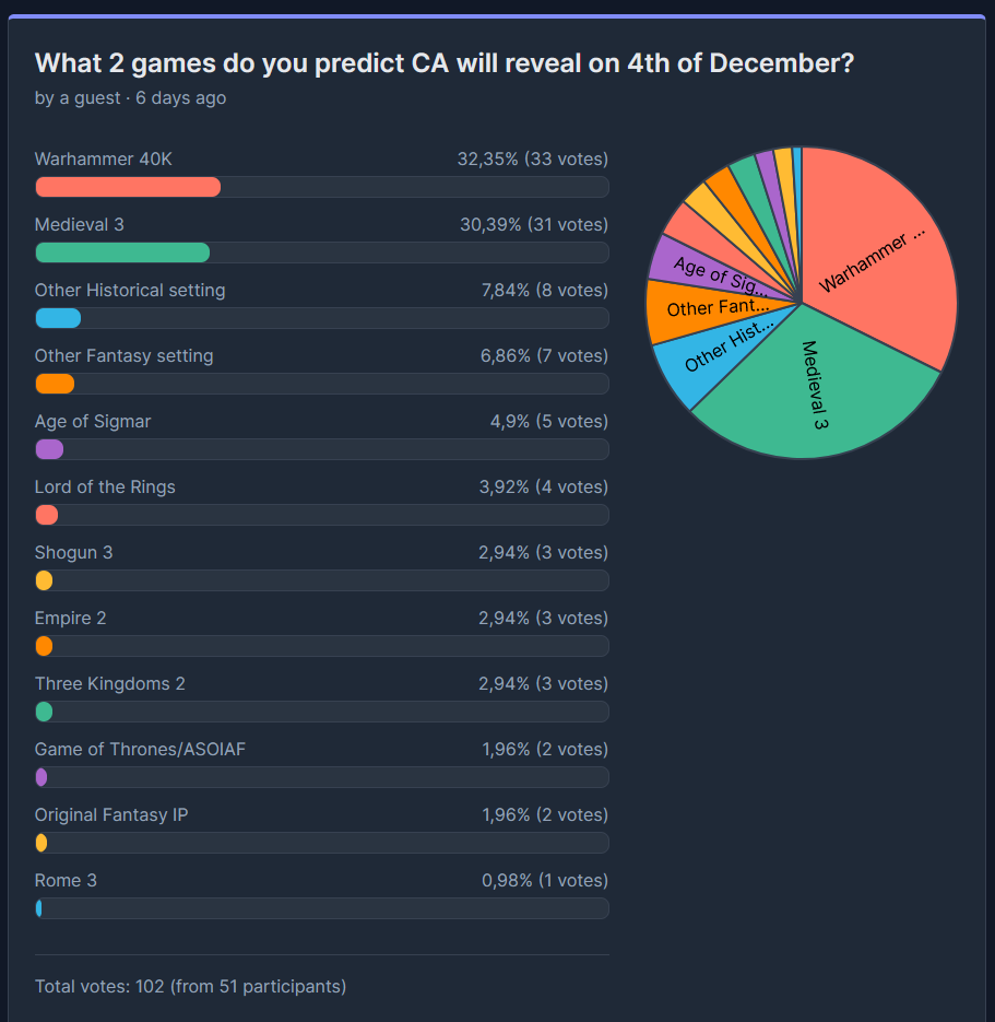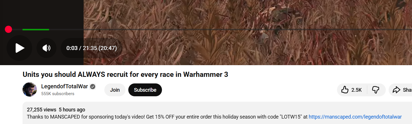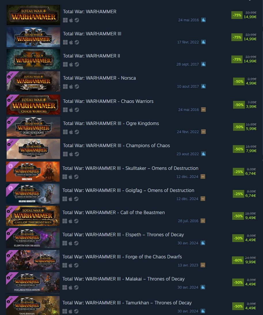 Sales are still ON Edition>Total War: Warhammer IIITides of Torment - Sayl Gameplay Showcase: https://www.youtube.com/watch?v=tNlLv9uKP6c Tides of Torment: Meet Sayl - https://community.creative-assembly.com/total-war/total-war-warhammer/blogs/83-tides-of-torment-meet-saylTides of Torment arrives on 4th December - https://community.creative-assembly.com/total-war/total-war-warhammer/blogs/85-total-war-warhammer-iii-tides-of-torment-arrives-on-4th-decemberTides of Torment trailer: https://www.youtube.com/watch?v=BsEX51KP6U8 TWW3 - What's Next: Fixes, Tides of Torment and More: https://community.creative-assembly.com/total-war/total-war-warhammer/blogs/80Hotfix 6.3.2: https://community.creative-assembly.com/total-war/total-war-warhammer/blogs/79-total-war-warhammer-iii-an-update-on-unit-recruitment-issuesPatch Notes 6.3: https://community.creative-assembly.com/total-war/total-war-warhammer/blogs/78-total-war-warhammer-iii-patch-notes-6-3Patch 6.3 Dev Blog: https://community.creative-assembly.com/total-war/total-war-warhammer/blogs/77>Stuff1d6chan: https://1d6chan.miraheze.org/wiki/Total_War_Warhammer/TacticsRoll Charts: https://imgur.com/a/81snQma>Older TitlesSteam: https://store.steampowered.com/franchise/TotalWar-Officialprevious thread :>>548130445