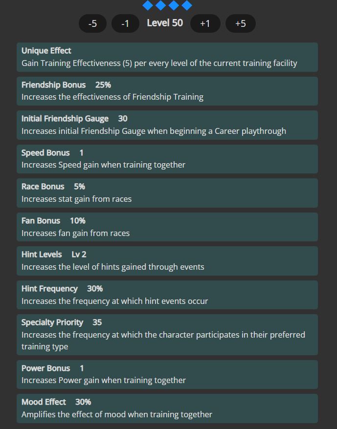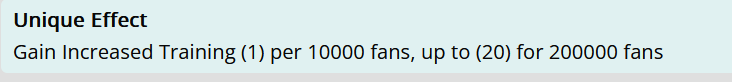 >>548271093>Unique Effect>Gain Increased Training (1) per 10000 fans, up to (20) for 200000 fans you need 200k fans to reach her full potential meaning you're stick with a mid card until third year, her events also suck and so does her goldNTR and THE THRONE were the biggest baits this game has ever seen and in retrospective it's clear why half the playerbase quit