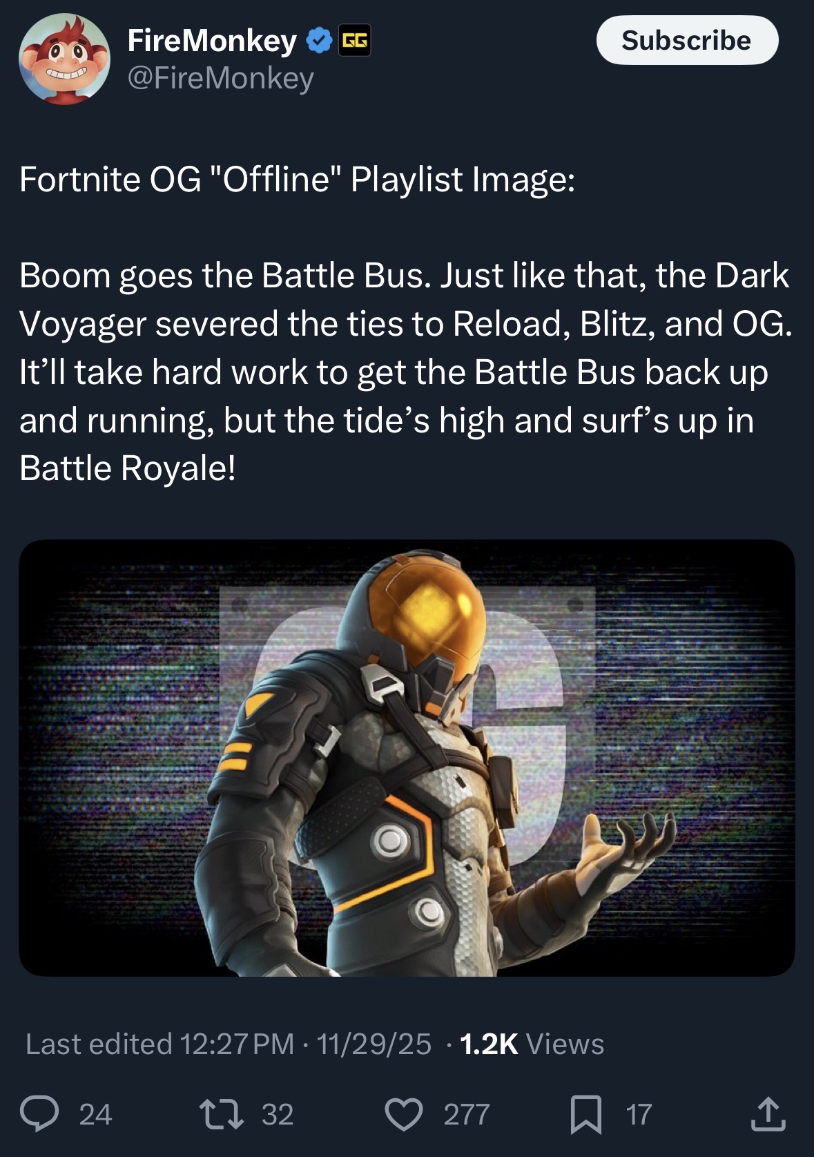 >Login between Nov 29th and Dec 9th to receive the Yuki Yubari Outfit>Fortnite Battle Royale Chapter Seven: Pacific Break | Cinematic Trailerhttps://www.youtube.com/watch?v=Eln66CJHna8>Fortnite’s Zero Point: The Story So Farhttps://www.youtube.com/watch?v=sfVP0dPJcgo>The Lost Chapter: Yuki’s Revenge | Teaser Trailerhttps://www.youtube.com/watch?v=x7h1aMVdBEk>Quests, stats, shophttps://fortnite.gghttps://fortnite.gg/statshttps://fortnite.gg/shophttps://www.fortnite.com/item-shop>Quick XP Strategyhttps://arch.b4k.dev/vg/search/text/3126-9885-4862/>Season XP Leveling Pacehttps://www.fortnitexp.net/>Mission Alerts for StWhttps://freethevbucks.com/timed-missions/https://fortnitedb.com/>LISA is the Next Fortnite Festival Season Iconhttps://www.fortnite.com/news/lisa-is-the-next-fortnite-festival-season-icon>Join the Road to the $1,000,000 Unreal Cup in Fortnite Competitivehttps://www.fortnite.com/news/join-the-road-to-unreal-in-fortnite-competitive>Bringing Hero Classes to Odysseyhttps://www.fortnite.com/news/were-merging-lego-fortnite-expeditions-with-odyssey-by-bringing-hero-classes-to-odyssey>Fortnite Ballistic v37.10 Adds the Veiled Precision SMG, Deployable Wall Gadget, and Morehttps://www.fortnite.com/news/fortnite-ballistic-v37-10-adds-the-veiled-precision-smg-deployable-wall-gadget-and-more>Fortnite Crew November 2025 - Maxx Speedhttps://www.fortnite.com/fortnite-crew-subscriptionPrevious:>>548301962