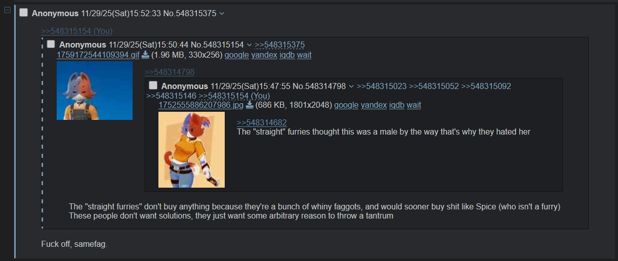 >>548310907>clearly male>has to pretend it's not because... his straightness? or somethingLmao so pathetic how low straight furries have to fall to eat a single dog bone crumb
