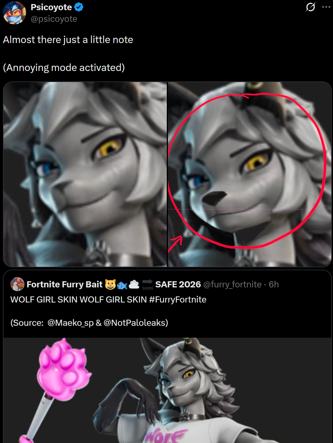 >1 female furry skin every 2 years>always a butchered faceIt feels intentional at this point, how can you do 700 male furry faces completely fine but can't get 1 singular good anthro girl with a snout that isn't a RTL quirk chungus silly Billy face?