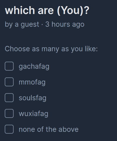 >>548355232I just wanted to cultivate mycore and play mahjong...I wonder which is worse, MMO playerbase or Gacha game playerbase.