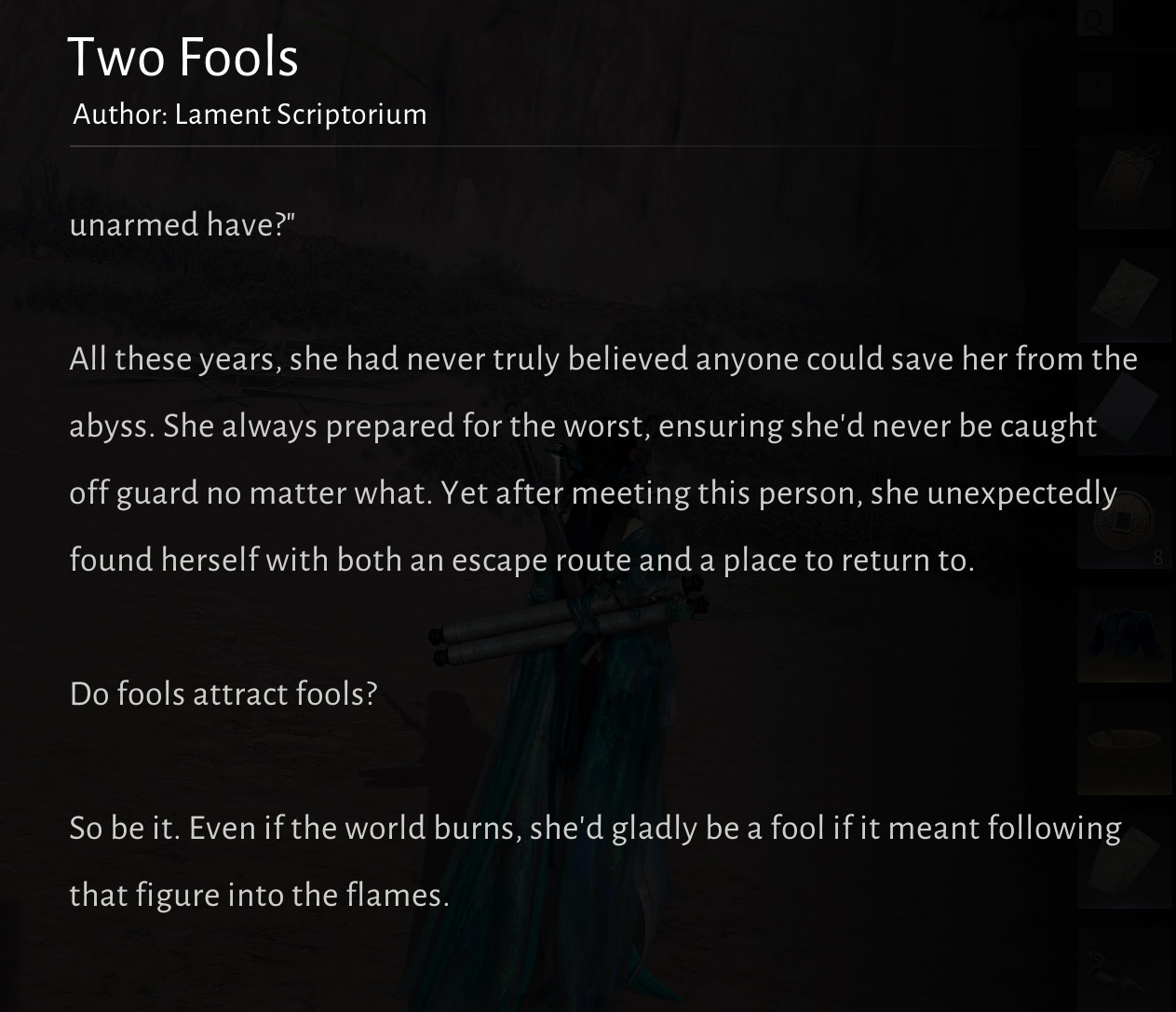 >Beat Tian Ying after a solid session of attempts>Realize how I weirdly seemed to get worse and less far in the battle over time>Got frustrated>Eventually got back in the rhythm>Finally beat it anyway>Look at my inventory afterward>See thiskill me