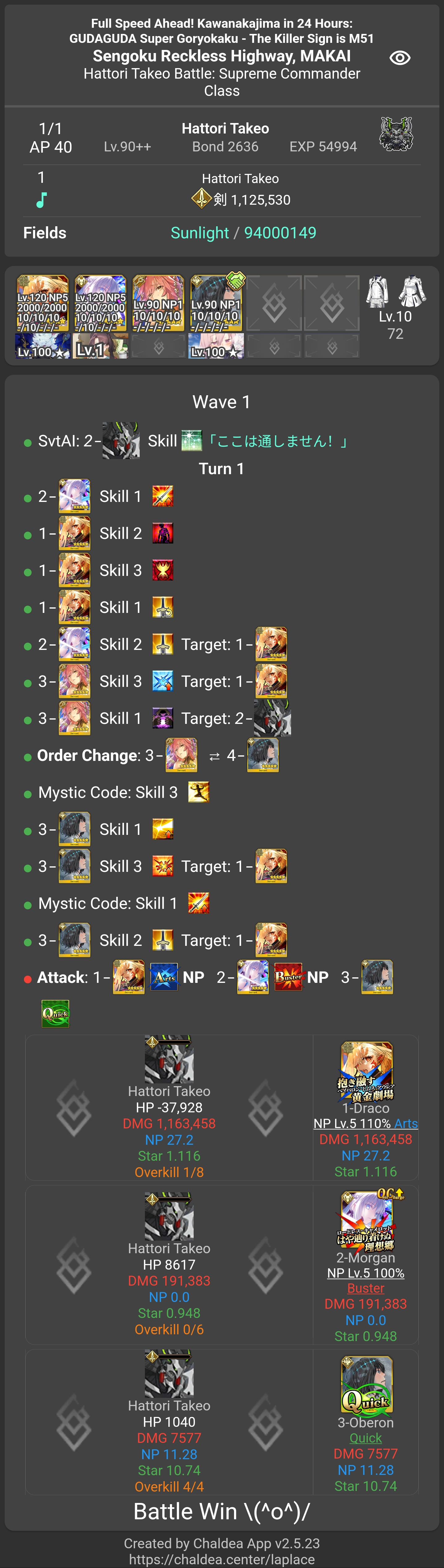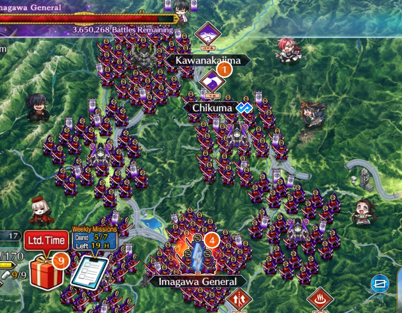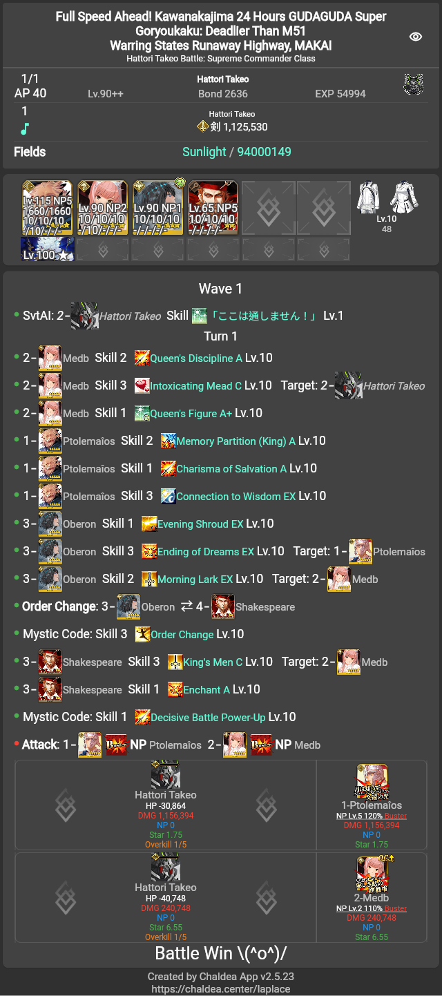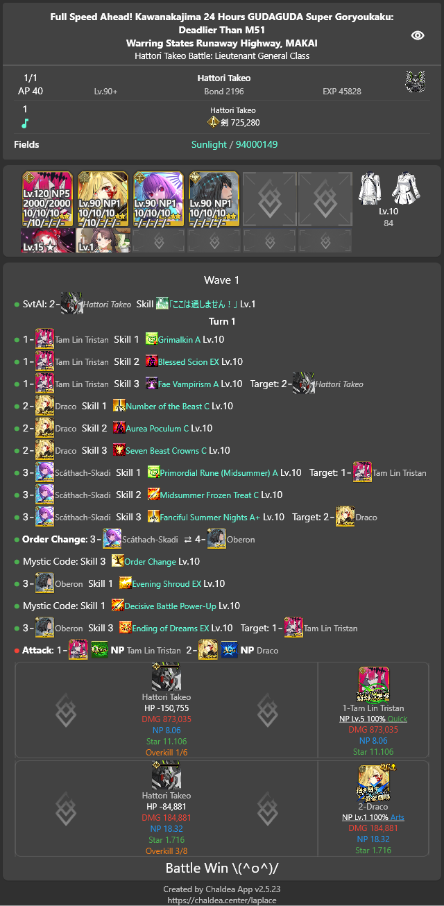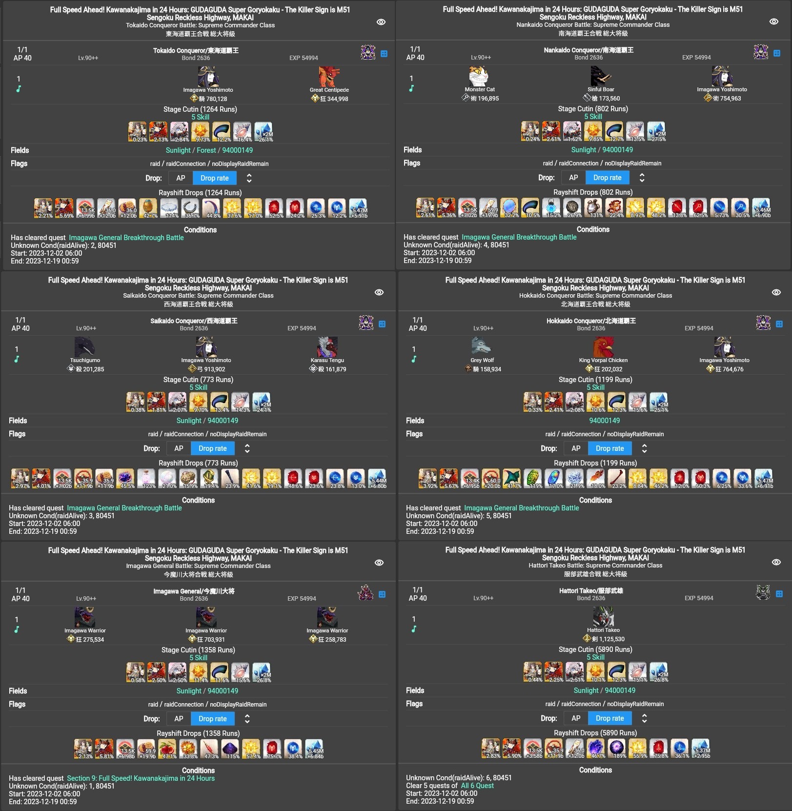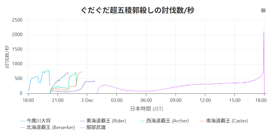 今魔川大将: 2時間 12分 (12月2日 20:12 JST)北海道覇王 (Berserker): 1時間 50分 (12月2日 22:05 JST)西海道覇王 (Archer): 2時間 39分 (12月2日 22:54 JST)南海道覇王 (Caster): 3時間 15分 (12月2日 23:31 JST)東海道覇王 (Rider): 4時間 42分 (12月3日 00:58 JST)服部武雄: 17時間 0分 (12月3日 18:00 JST)