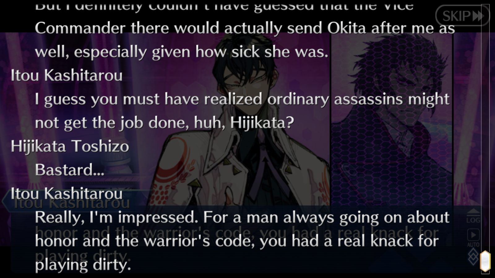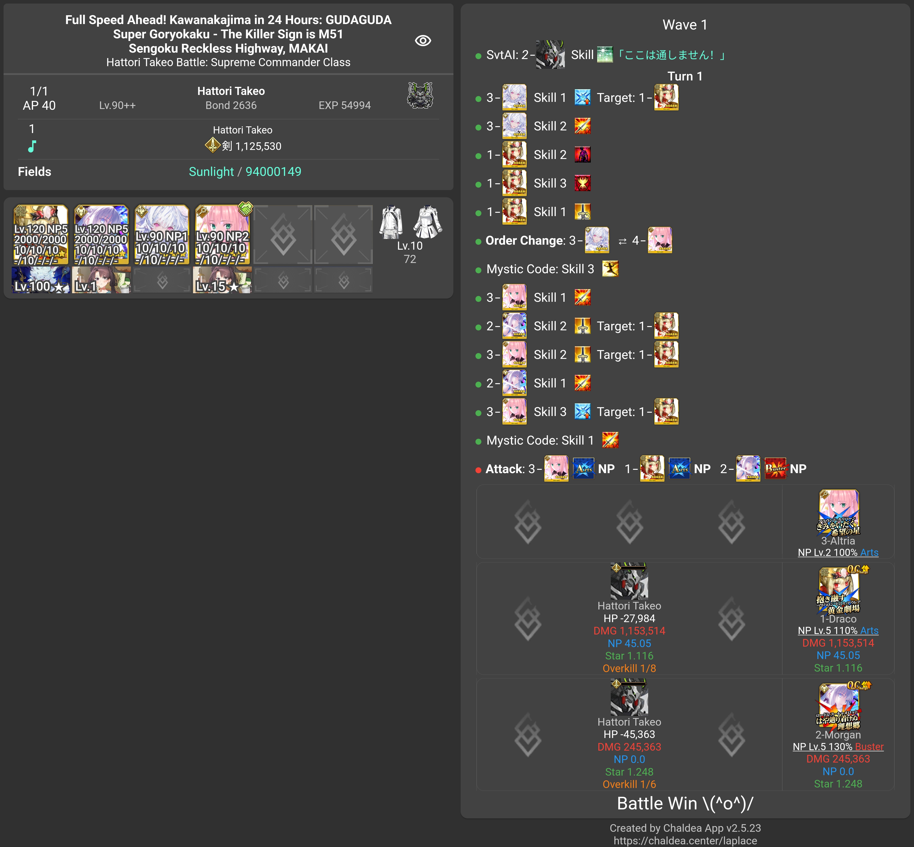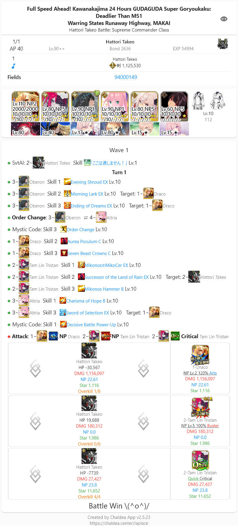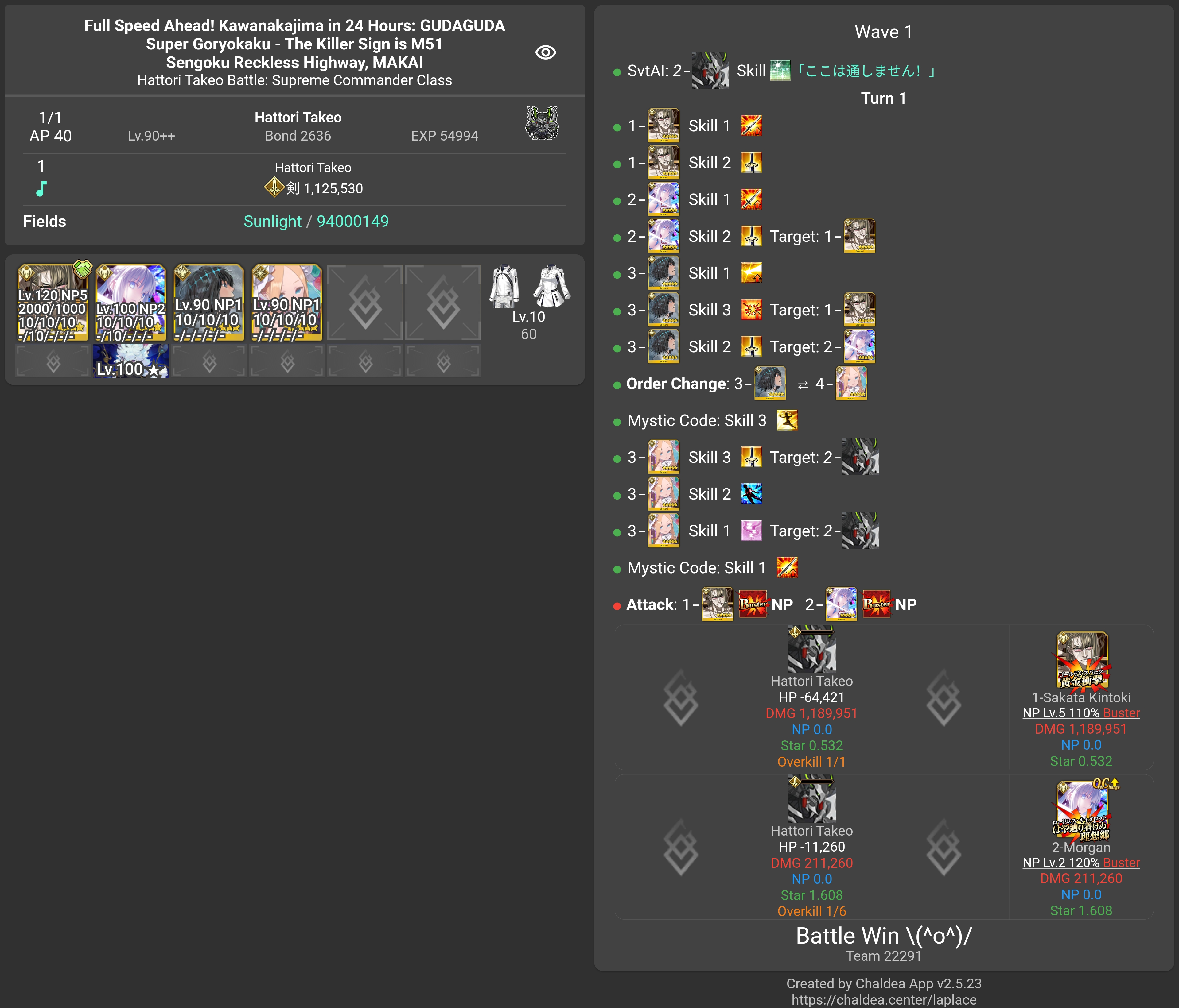 今魔川大将: 2時間 12分 (12月2日 20:12 JST)北海道覇王 (Berserker): 1時間 50分 (12月2日 22:05 JST)西海道覇王 (Archer): 2時間 39分 (12月2日 22:54 JST)南海道覇王 (Caster): 3時間 15分 (12月2日 23:31 JST)東海道覇王 (Rider): 4時間 42分 (12月3日 00:58 JST)服部武雄: 17時間 0分 (12月3日 18:00 JST)