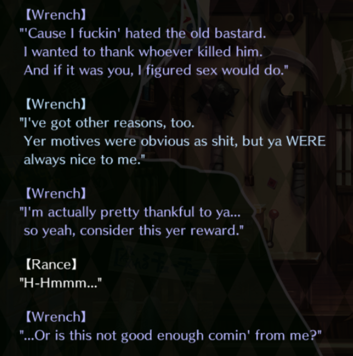Daiakuji update.After months of stalling because reasons, I'm back on the grind. Mercs are all done, starting with the Takayamas now.However, I'm gonna start skipping the H-scenes FOR NOW, and wrap them all up in one go once everything else is done. Might even release a 0.9 version with everything but the H-scenes to see if everything's working (I'm STILL having problems, believe it or not, even more so than before), then finish them and release the completed version. The reason being that holy shit H-scenes are so tedious that they sap motivation like nothing else.I still don't know when this'll be released, I want to do it by next year but no promises. Would be a guarantee if my doujin TL contacts helped with the H-scenes...