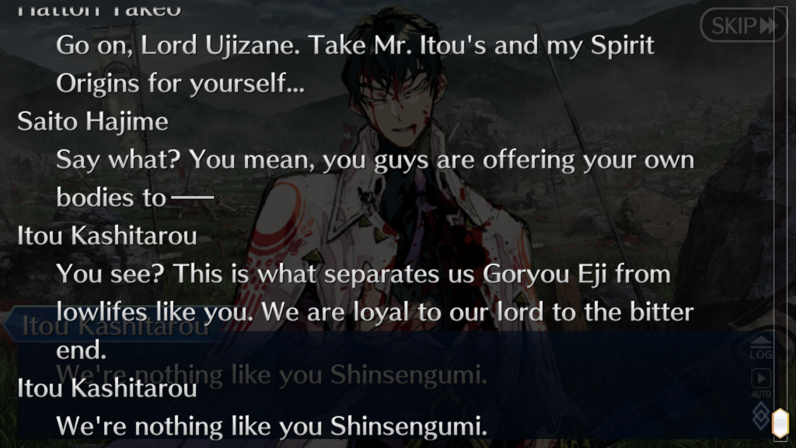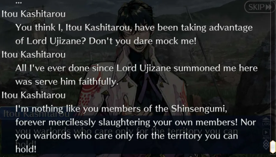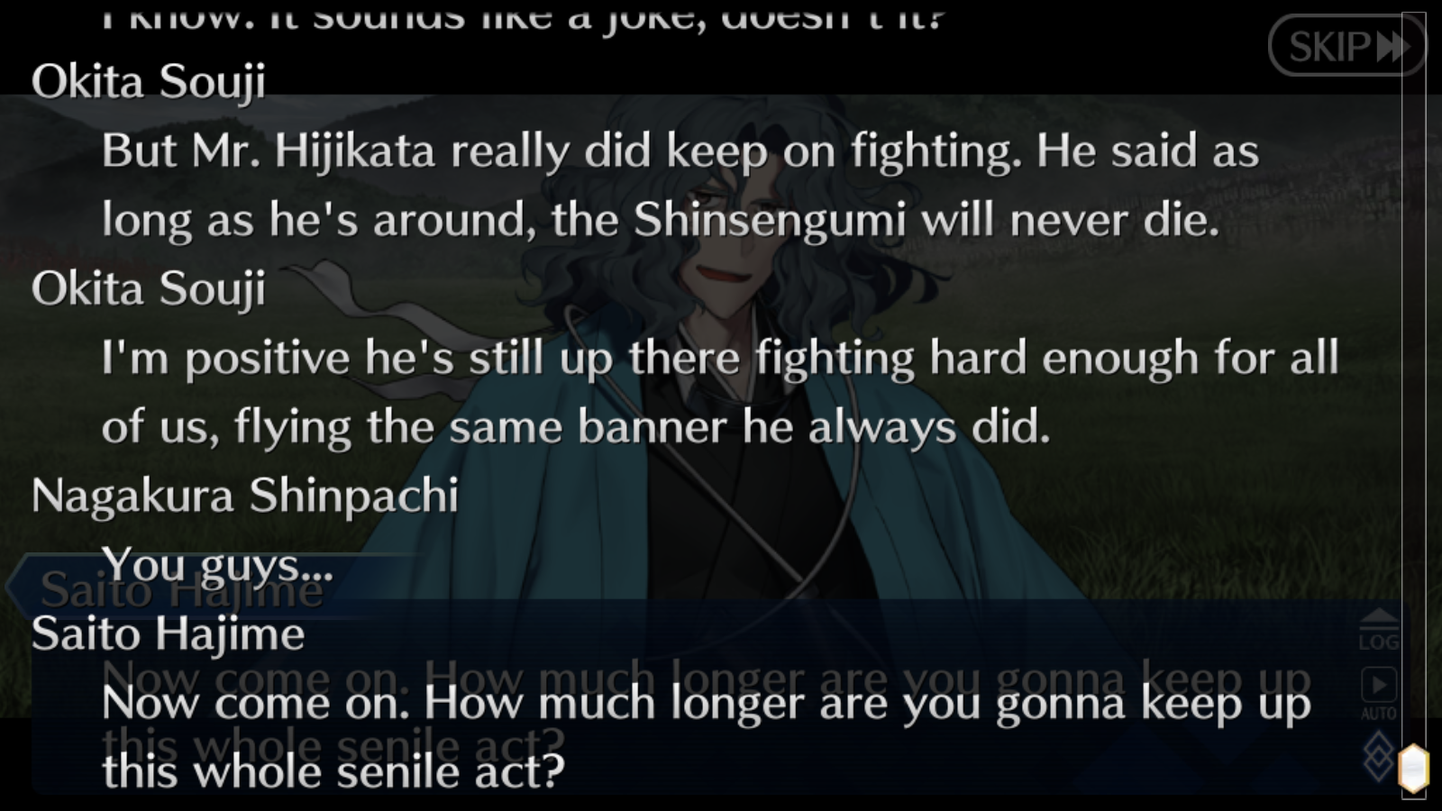 Okita is an autist murder machine that will just stab anything, Hijikata that acts as a cool guy and goes cool full berserker on battle is just an authoritary cunning bastard wich first answer to everything is "kill them". Saito is an asshole that seems to kind of regret his decissions but does it again for the 10th time
