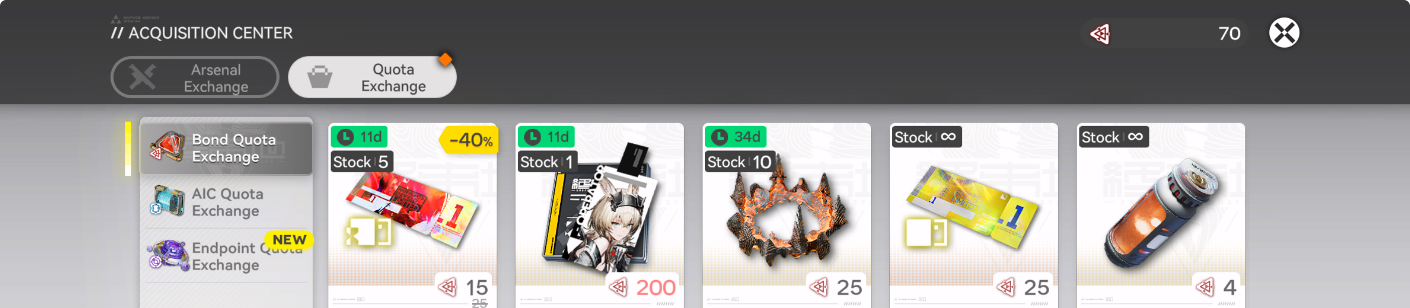 [11/21-12/5][Standard]6* Caster Lin, 6* Executor The Ex Foedere (Shop), 5* Vanguard Fang the Fire-sharpened, 5* Supporter Bobbing, 5* Supporter Proviso (Shop)