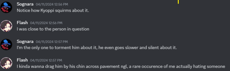 >>548531351“You can’t just expose my bad behavior with receipts and post it in thread! That ruins my threadcred and that’s worse than being a manipulative asshole to you in DMs!”