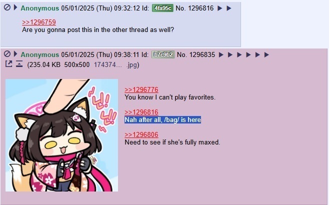 Not just Blue Archive but also /bag/. /bag/ is a part of my life. All of you are part of my life. I can't remember a time where I haven't visited /bag/ for more than a day.