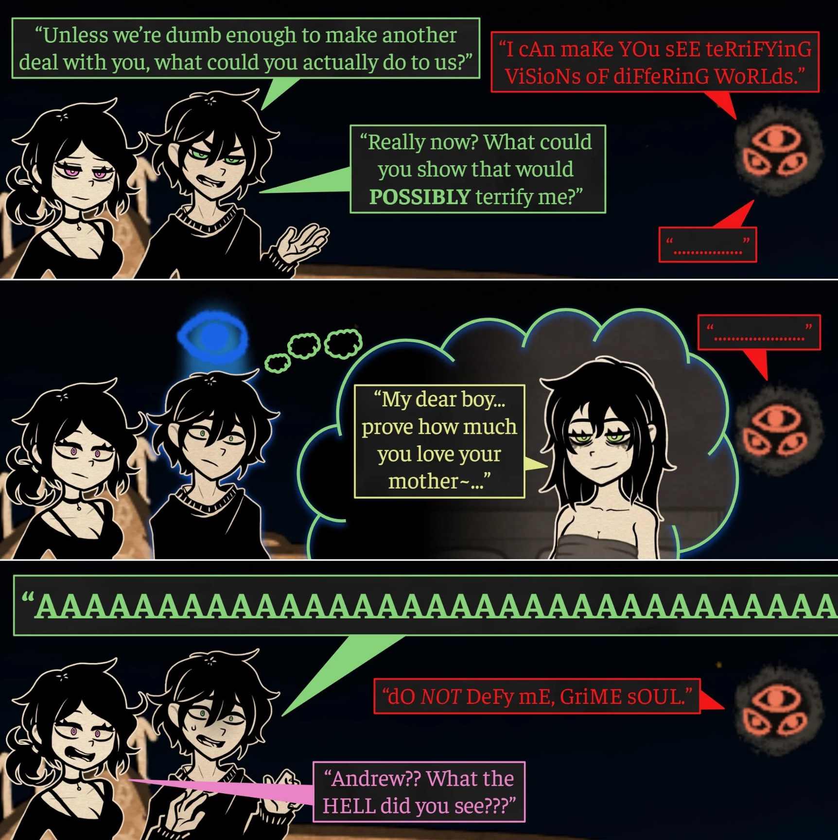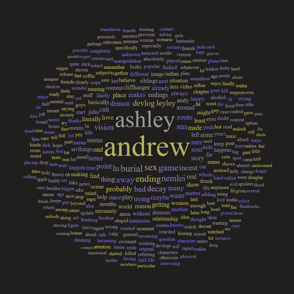 >>548563787Calling it nowThis isn't part of Decay; it's BurialAshley gets swept up into the cult because they feign to offer her unconditional love and support.Just like real cults, they try to play into all her insecurities and wants. It's all a facade, they're only doing it because they found out that she is successful at regularly summoning demons and has the talisman given to her by ???. She'll start to need Andrew less since she has a new support net, and she'll even taunt him about this with stuff like "I have new friends. I bet you're soooooo jealous" or "They treat me better than you EVER did!". It'll rock her worldview when he responds with something like "Oh cool. You're actually learning how to socialize. Now you won't need me for literally everything. Nice."His nonchalant attitude will make her worry that he never really loved her as much as she thought. The cult will prey upon this fear, and manipulate her even more. When they eventually betray her or she finds out they were just using her, she will probably have the biggest meltdown we've seen.After that... idk, the story could go two directions. Either she realizes how precious Andrew is to her since he was always so loving without any ulterior motives. The alternative is that her mental state spirals out of control and she only doubles down on her obsessive need to have Andrew no matter what.