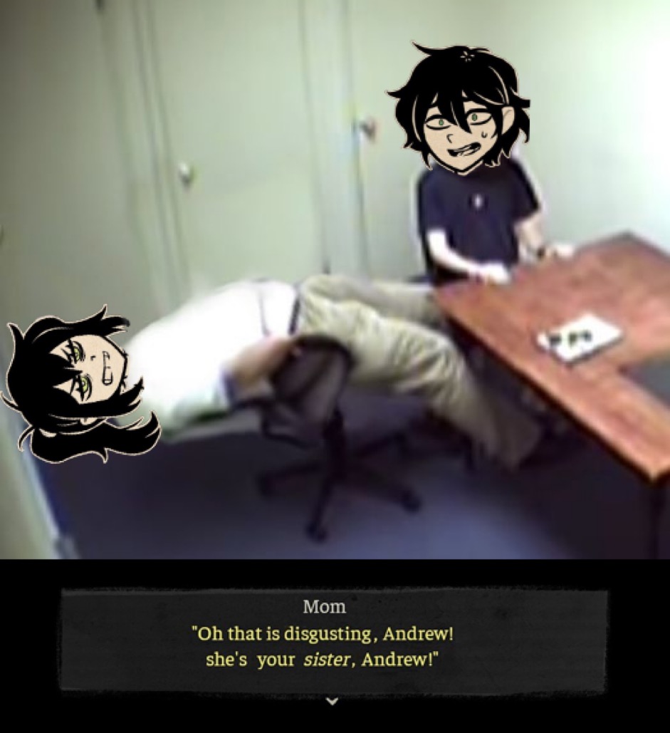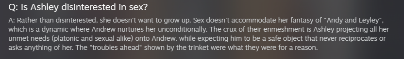 Whoops, gonna reply to a post from previous thread, missed new one.>>548541134>>548541086My point is, the narrative of the game does not depict the subject of incest as stritcly good or bad.In Shots and Such, it's shown as miserable and toxic, because they're regressing and going insane, but in Cliffhanger, it's so far shown positive to neutral, with Andrew's kissing Ashley being more of a wholesome moment, if it even can be called as one.in Cliffhanger's visions themselves, Andrew himself isn't sure what to make of the attraction but his knee jerk is to see it as predatory.Ashley treats eloping as a way to live together and make their own lives.whether it's a good or bad thing is more or less treated neutrally, it'll be a joke if it's funny for cringe comedy, be horrific in context of abuse, or be shown as a way for them to understand their feelings for each other, it's dependant more on the mental states of the Graves, and incest is just one extension of their relationship.