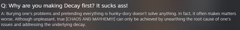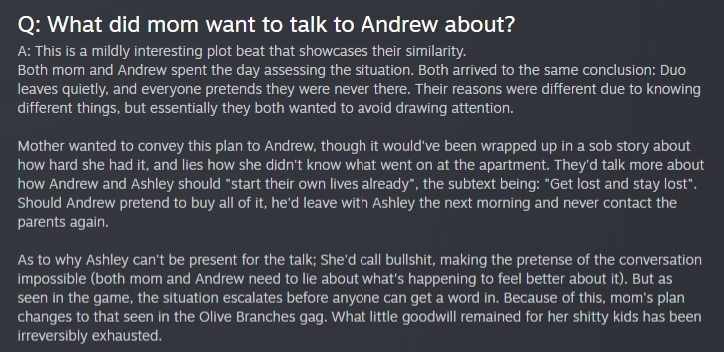 >>548576339Nems has said Decay and Burial are not going to share any content, but I still wonder if there will be some overlap, like flashbacks of the same events from Andrew's flashbacks but from Ashley's perspective. Surely some of the backstory stuff from Decay has to be relevant in Burial as well, it gives important context for Andrew and Ashley's relationship