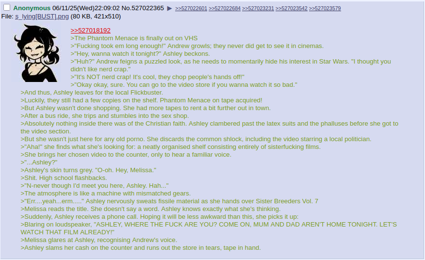 >>548622608>Supposed oldfag /calg/ veteran >Ashley watching incest porn to study brother seduction is "forced meme"Do you come here once a week, Oldrew?