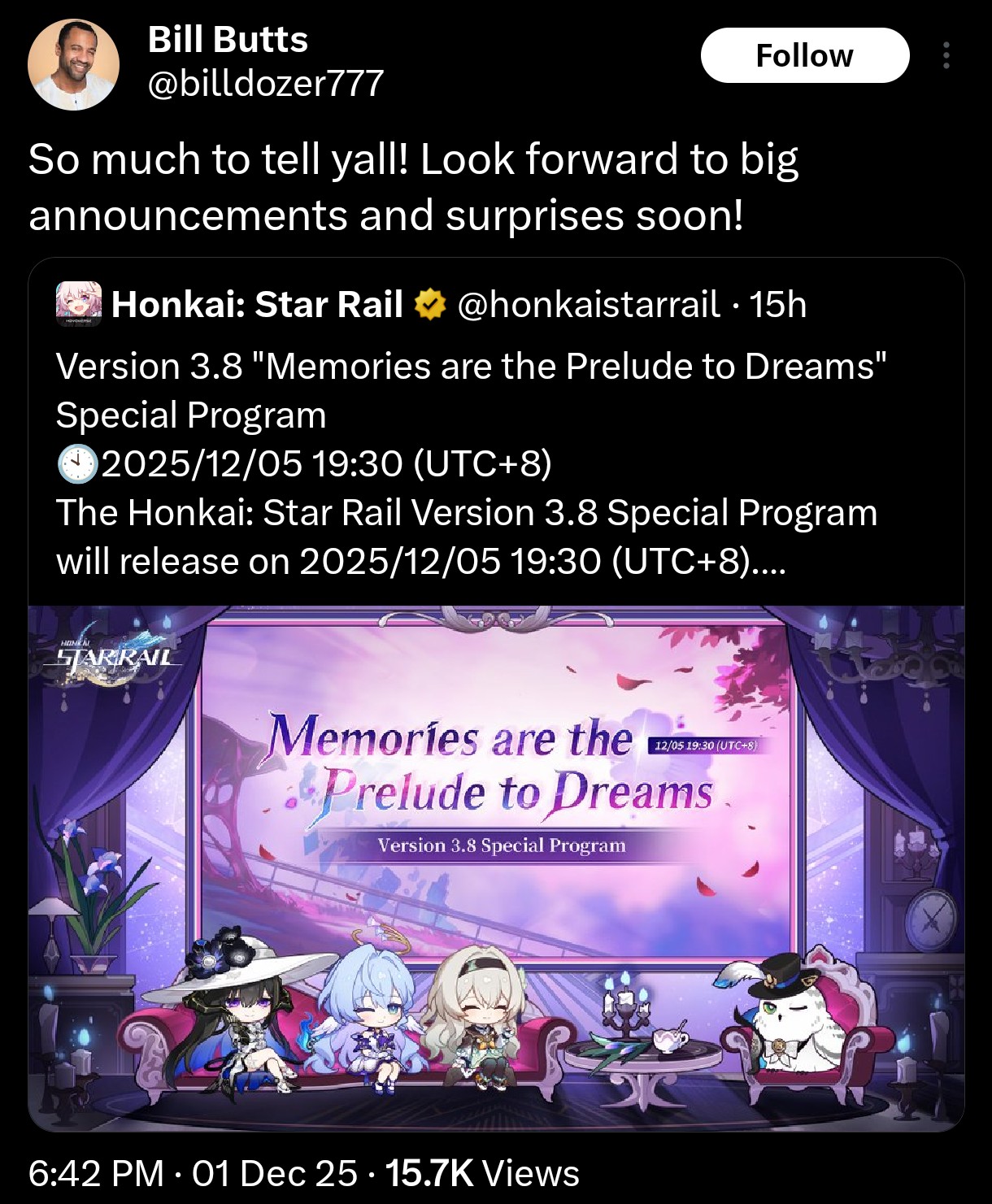 Previous: >>548540814>Version 3.8 "Memories are the Prelude to Dreams" Special Program will release on 2025/12/05 19:30 (UTC+8)https://www.youtube.com/watch?v=VrSInGzFFKs https://www.youtube.com/watch?v=fl5--WIcpCk >Download - https://hsr.hoyoverse.com/en-us/home>3.7 Preview Page - https://act.hoyoverse.com/puzzle/hkrpg/e20251024vesion_1316/index.html>Version 3.7 Trailer: "As Tomorrow Became Yesterday"https://www.youtube.com/watch?v=r4gljUbCzqAhttps://www.youtube.com/watch?v=-L1PxKwvJ74>Cyrene Character Trailer: "With You Once More"https://www.youtube.com/watch?v=CRAuK8T6Xishttps://www.youtube.com/watch?v=rtSkMbDs1Xw>Golden Epic Trailer: Farewell, Cyrenehttps://www.youtube.com/watch?v=Sn901sn5_B0https://www.youtube.com/watch?v=zHFGsd-KsX0>Animated Short: "Hello, World!"https://www.youtube.com/watch?v=LB_65-rOYYohttps://www.youtube.com/watch?v=_GG4BgkyRiY>Myriad Celestia Trailer — "Exotale: Scene 8"https://www.youtube.com/watch?v=x3bRer52asEhttps://www.youtube.com/watch?v=owFII5A3OfE>Current Character Banners: Cyrene, Phainon, Cipher, Mydei + Pela, Lynx, Moze - https://www.hoyolab.com/article/42482837>New Drip Marketing:>The Dahlia (5* Fire Nihility) - https://www.hoyolab.com/article/41861857>Redeemable Codes - https://hsr.hoyoverse.com/giftJS2QEA3SDHFKSTARRAILGIFTSTORYOFLOVEOMEGA>/hsrg/ Tools & Resourceshttps://rentry.org/hsrg-resources-14>/hsrg/ Thread Templatehttps://rentry.org/hsrg-thread-template-14