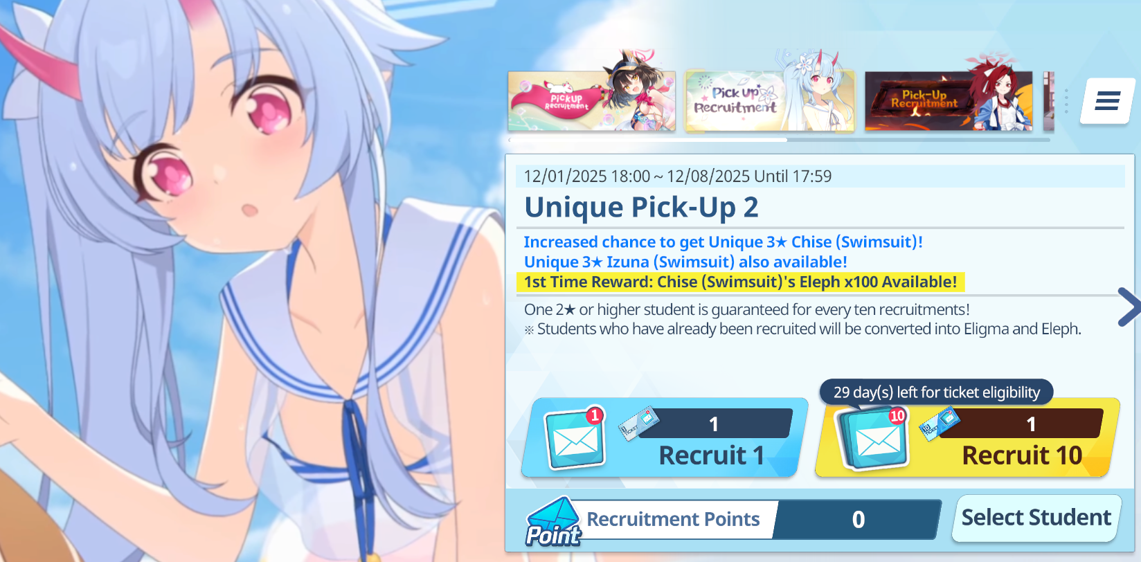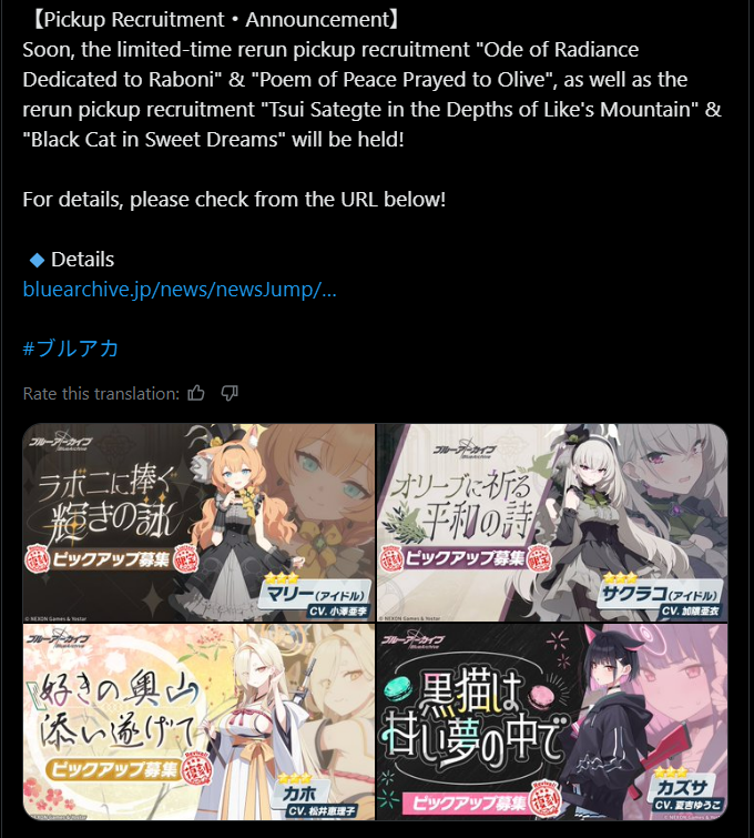 Previous Thread: >>548585291>Guides, Resources and useful links:https://rentry.org/bagguides>/bag/Circles/Clubs/Friends:https://rentry.org/holdingthebag>4koma, Manga, Side Content, PVs & Shortshttps://rentry.org/bacontent>>(JP)>Banners:>11/19 (Wed) After Maint – 12/3 (Wed) 10:59 (JST)Takane (3*)Yakumo (3*)>News:5th Anniversary Website: https://5th-anniversary.bluearchive.jpPatch notes: https://bluearchive.jp/news/newsJump/605>Events:Winter Skies Renaissance: On Wholesome Cultural Exchange – 11/19 (Tue) After Maint – 12/3 (Tue) 10:59 (JST)>Content:Total Assault: Kurokage (Urban) – 11/26 (Wed) 11:00 – 12/3 (Wed) 3:59 (JST)Limit Break Assault: Chokmah (Outdoor – w/Heavy Armor) – 11/20 (Thu) 11:00 – 12/24 (Wed) 3:59 (JST)2x Normal – 11/26 (Wed) 4:00 – 12/3 (Wed) 3:59 (JST)2x Lesson – 12/3 (Wed) 4:00 – 12/10 (Wed) 3:59 (JST)2x Hard – 12/10 (Wed) 4:00 – 12/17 (Wed) 3:59 (JST)2x Commission – 12/17 (Wed) 4:00 – 12/24 (Wed) 3:59 (JST)>>(GLOBAL)>Banners:>12/2 (Tue) After Maint – 12/9 (Tue) 1:59 (UTC)Izuna (Swimsuit) (3* – Limited – Rerun)Chise (Swimsuit) (3* – Limited – Rerun)Renge (3* – Rerun)Yukari (3* – Rerun)>News:Patch notes: https://forum.nexon.com/bluearchive-en/board_view?thread=3274044Event Pre-registration & Update Roadmap Special Page: https://bluearchive.nexon.com/events/2025/12/4th>Events:Balancing Schale's Books with the General Student Council – 12/2 (Tue) After Maint – 12/16 (Tue) 1:59 (UTC)>Content:Joint Firing Drill (Escort) – 12/2 (Tue) After Maint – 12/8 (Mon) 18:59 (UTC)Limit Break Assault: The Fury of Set (Field – w/Light Armor) – 11/19 (Wed) 2:00 – 12/15 (Mon) 18:59 (UTC)2x Normal – 12/1 (Mon) 19:00 – 12/8 (Mon) 18:59 (UTC)2x Account EXP – 12/5 (Fri) 19:00 – 12/8 (Sun) 18:59 (UTC)2x Scrimmage/Commissions – 12/8 (Mon) 19:00 – 12/15 (Mon) 18:59 (UTC)3x Bounty/Lesson – 12/15 (Mon) 19:00 – 12/22 (Mon) 18:59 (UTC)2x Account EXP – 12/19 (Fri) 19:00 – 12/21 (Sun) 18:59 (UTC)