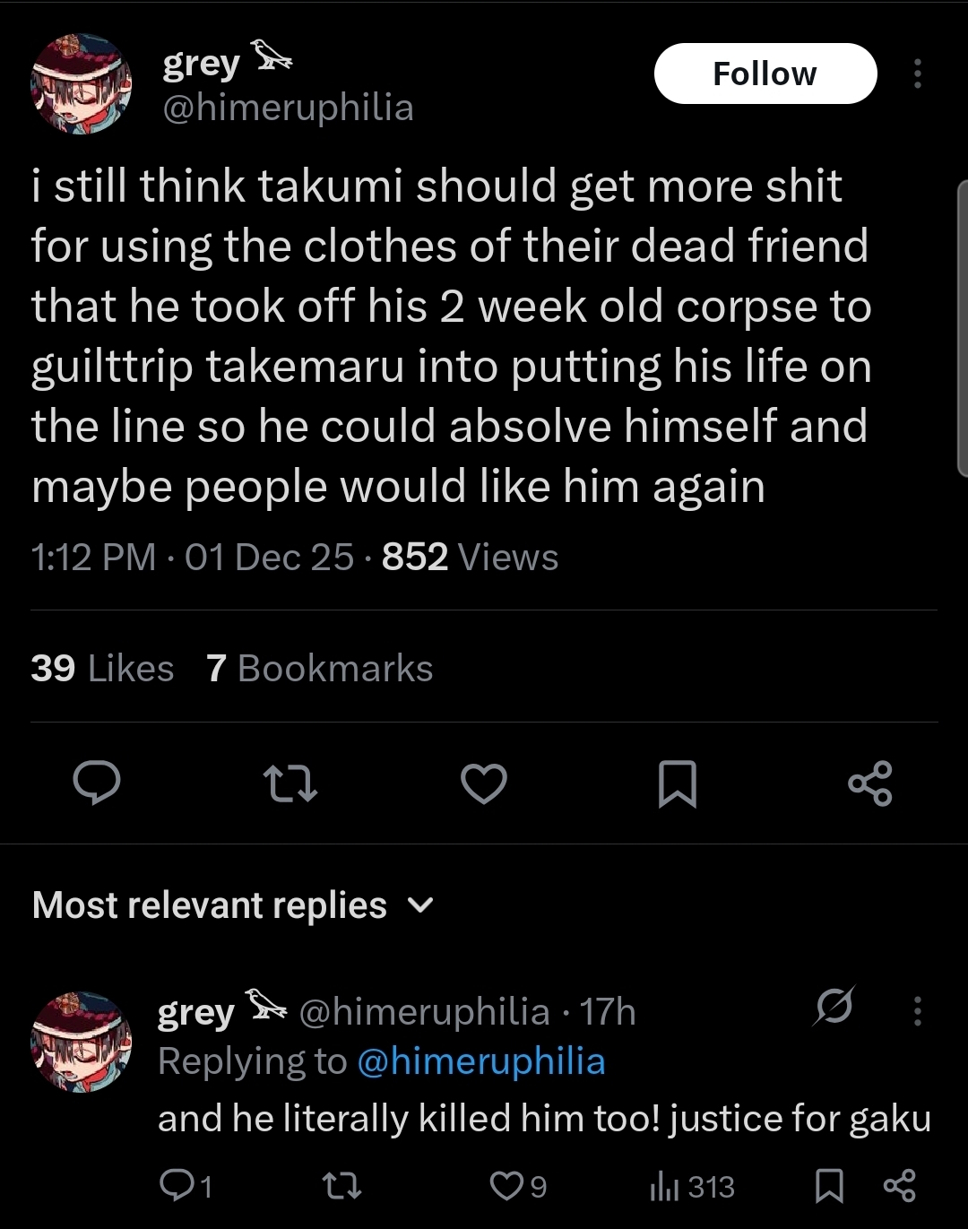>>548638565if he's so smart and mature, why doesn't Kako and Hiruko fuck him and instead they fuck Takumi