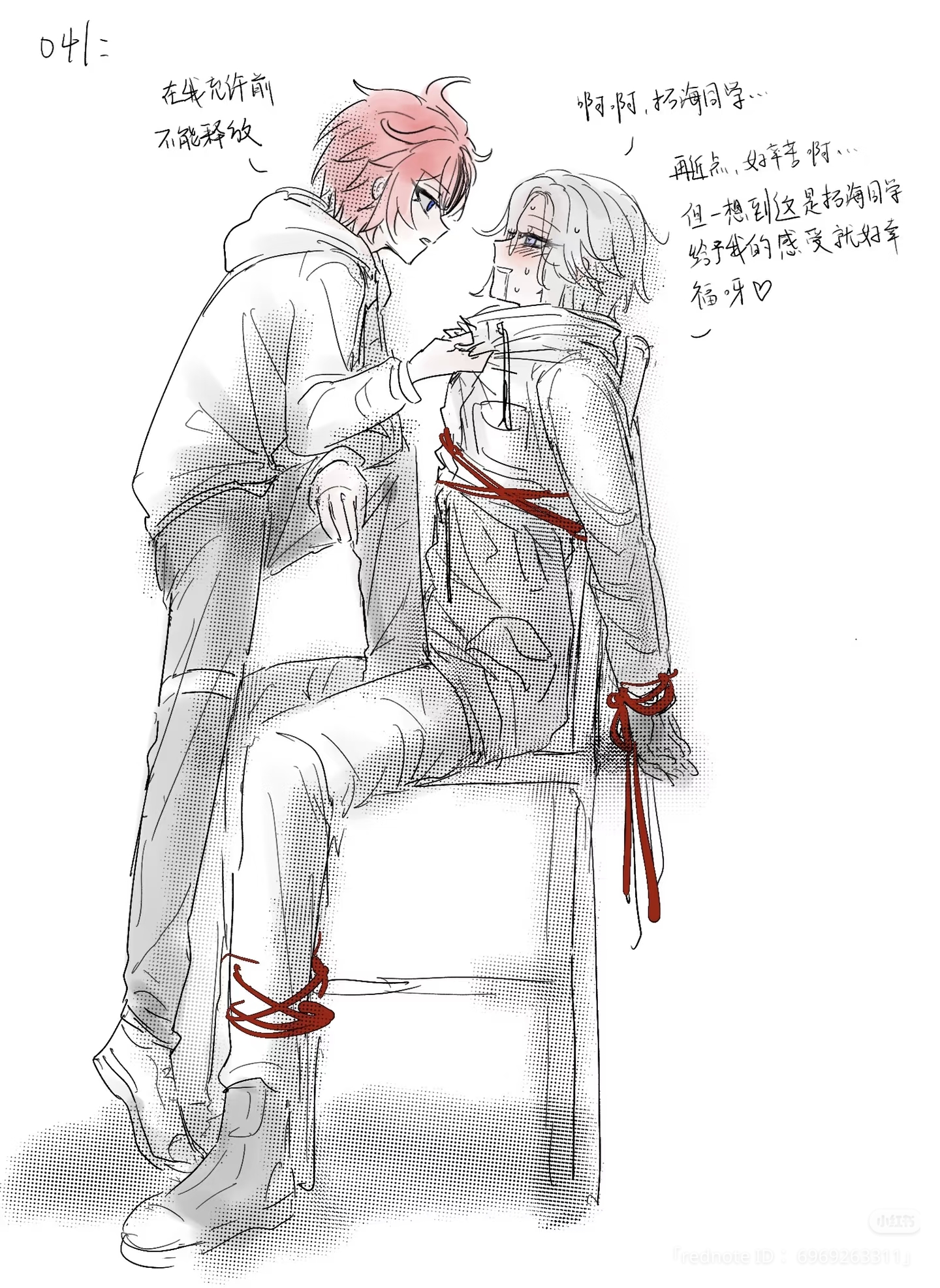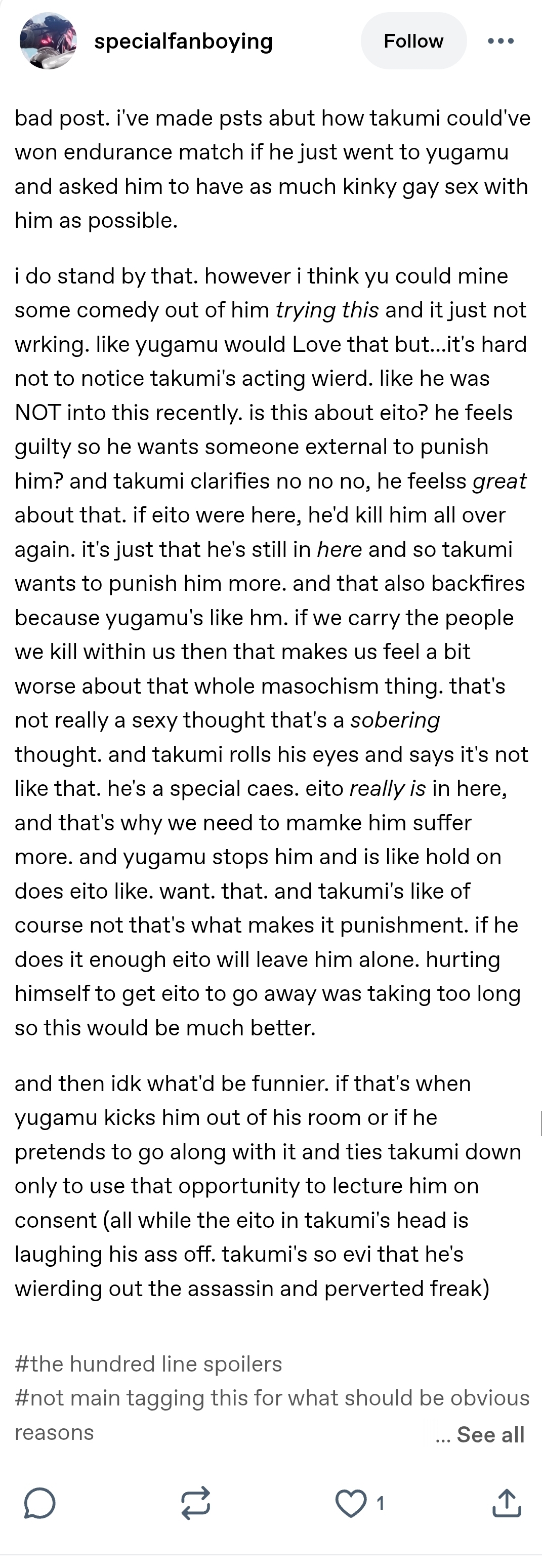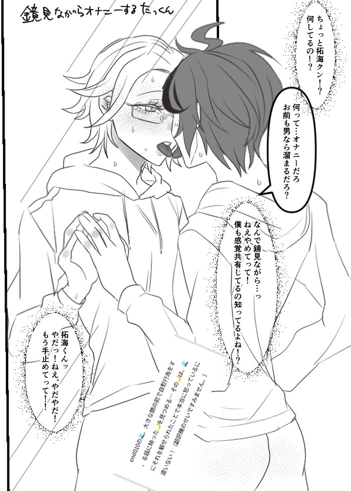 >>548690938I've seen multiple (ha) fanart and fics where Takumi masturbates and Eito has to endure it after they become one in 010, like picrel and the continuation below https://files.catbox.moe/ss53wx.jpg