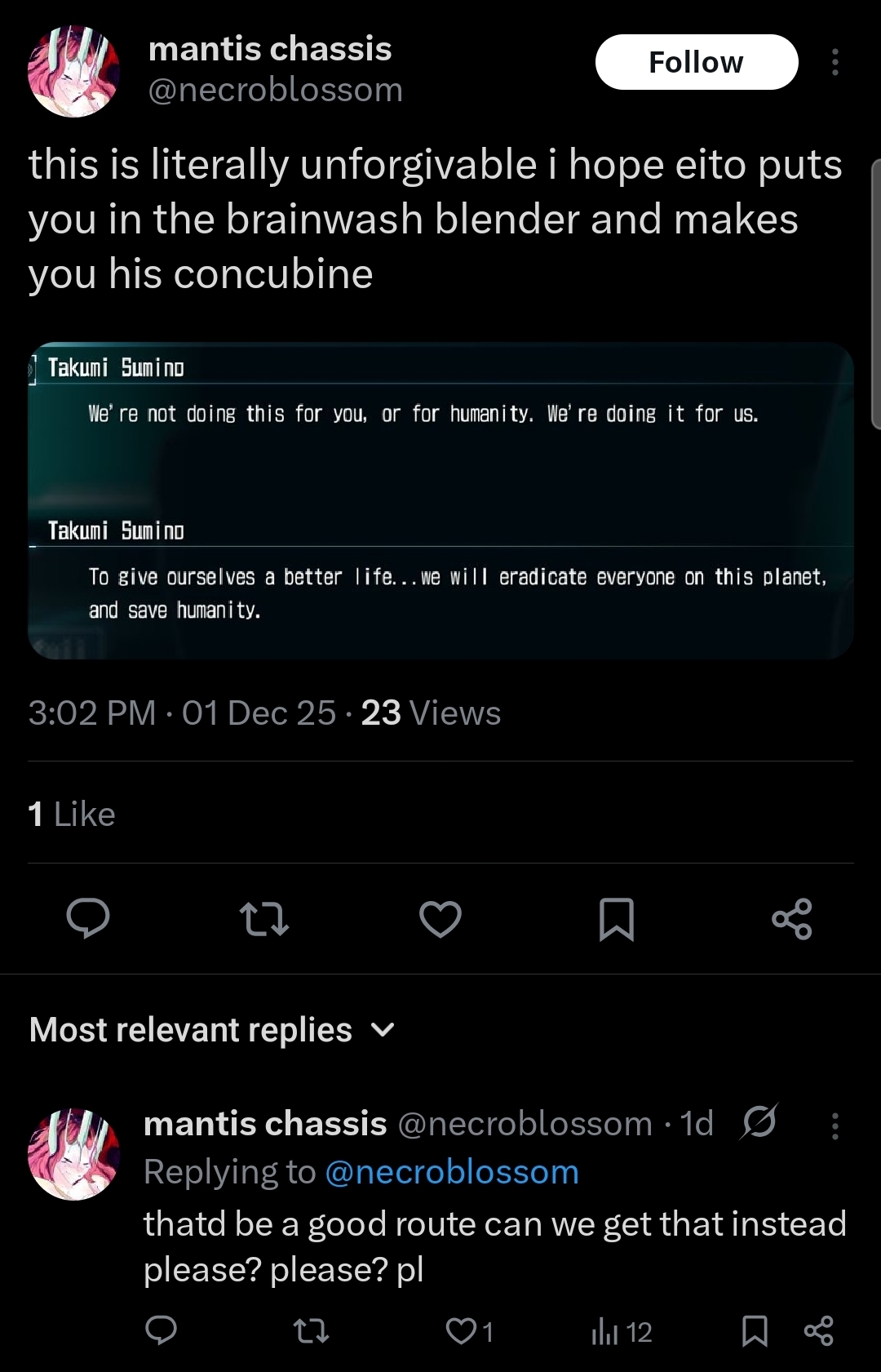>>548706025they're mad at what Takumi does but the whole game is about how your choices determine what happens, what a fucking sillypants