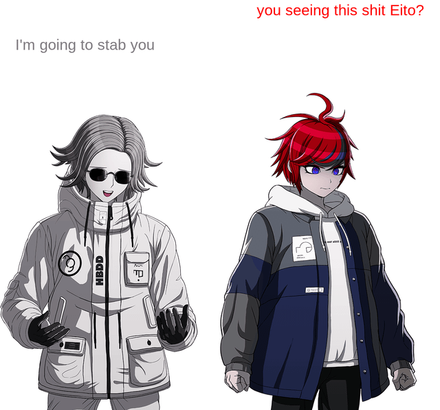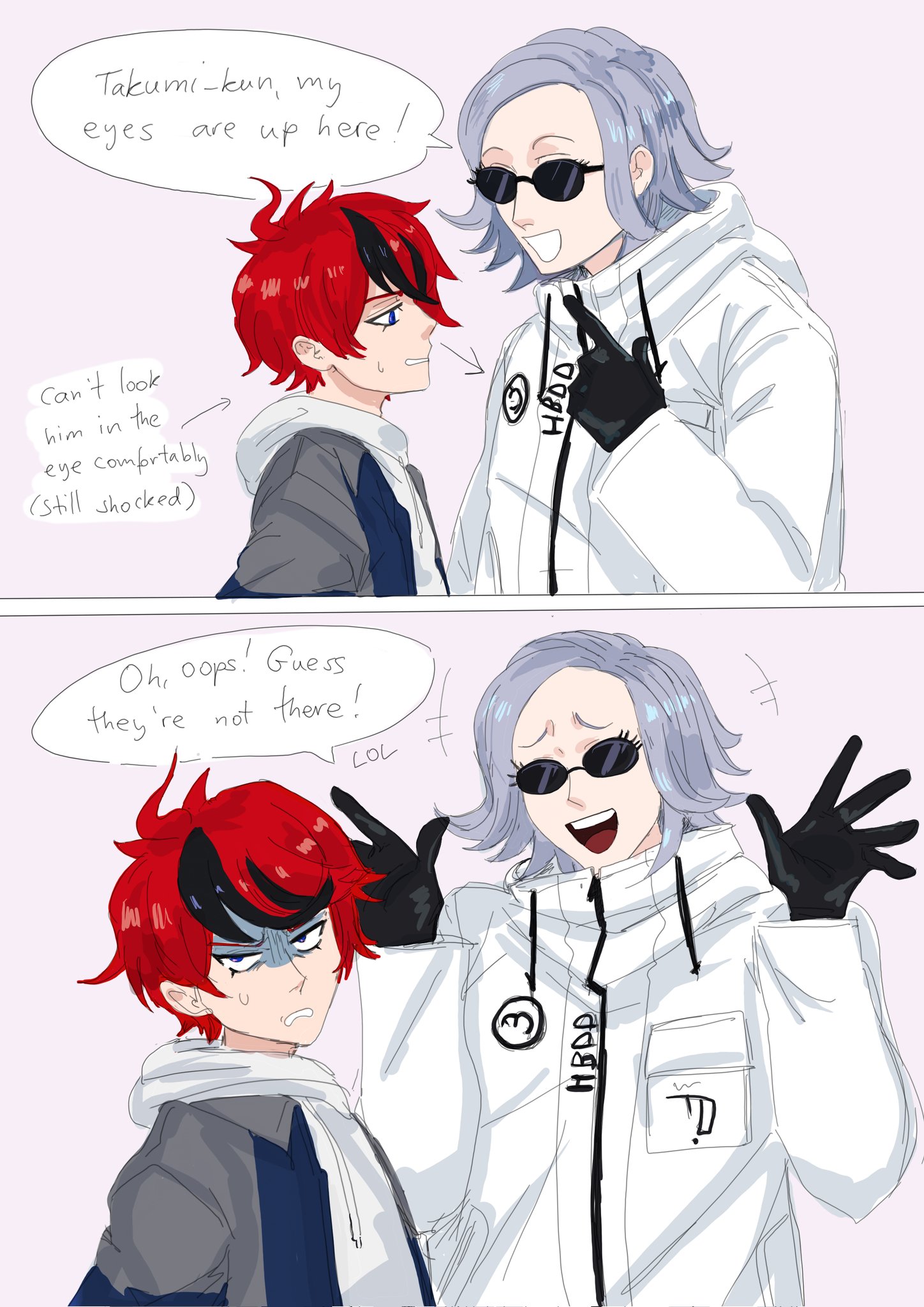 >>548710967This picture is OOC because Eito himself jokes about not seeing stuff. I guess he can pretend to be offended by Takumi to mess with him a little...