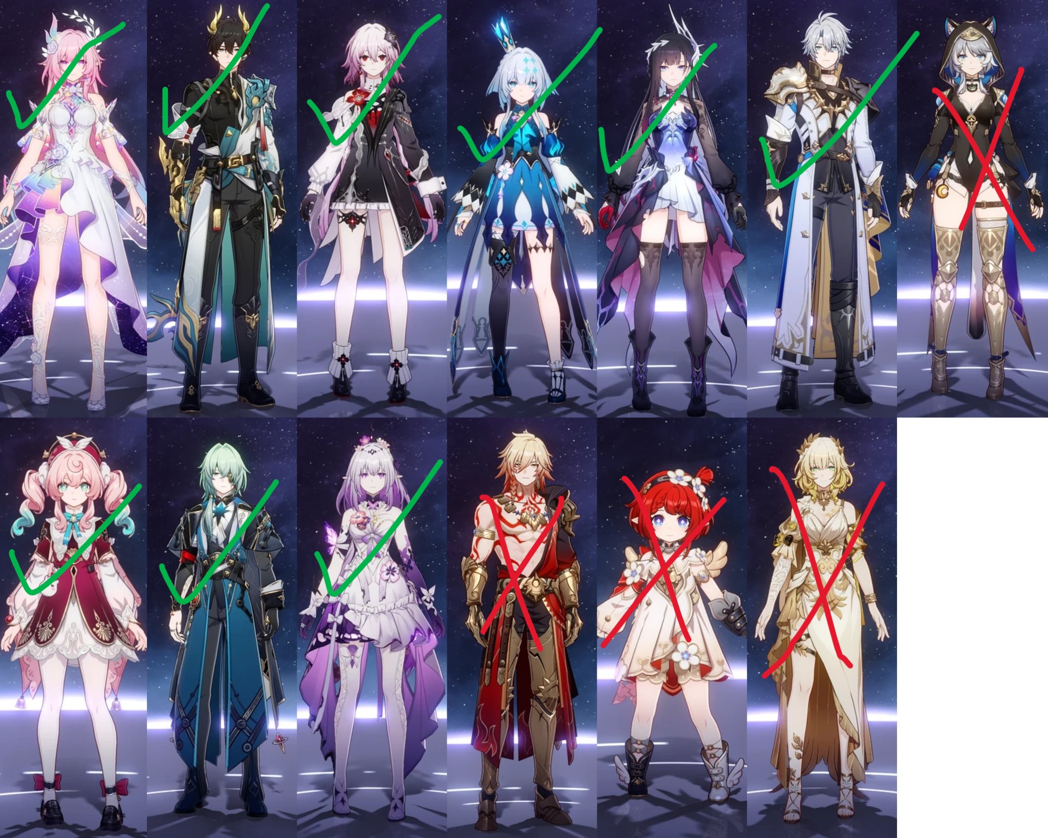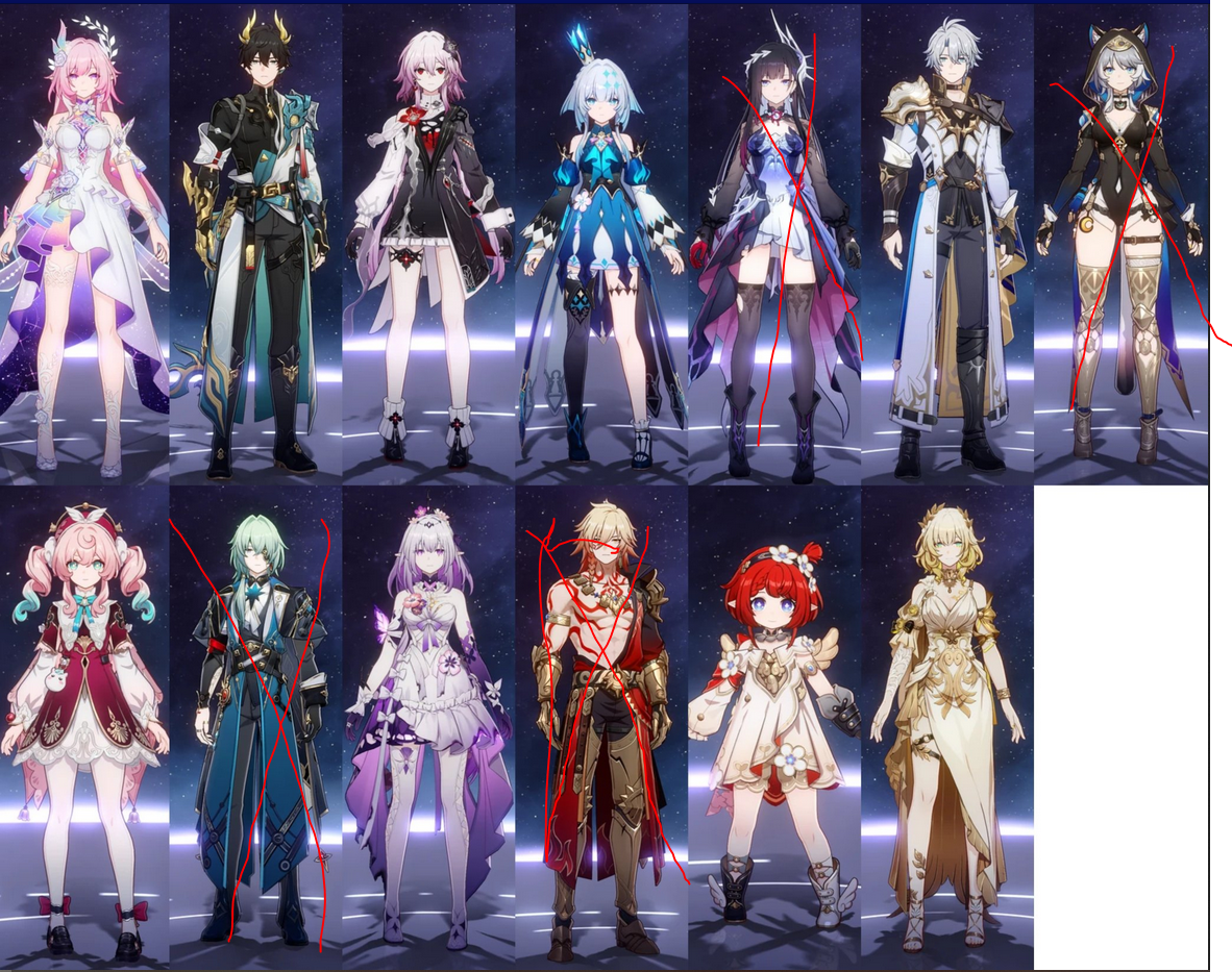 >>548616079Tribbie, Castorice, Hyacine, CyreneI'd have gotten Evernight if I had been paying attention to HSR during her banner, but I was busy with other stuff so I only logged in for dailies