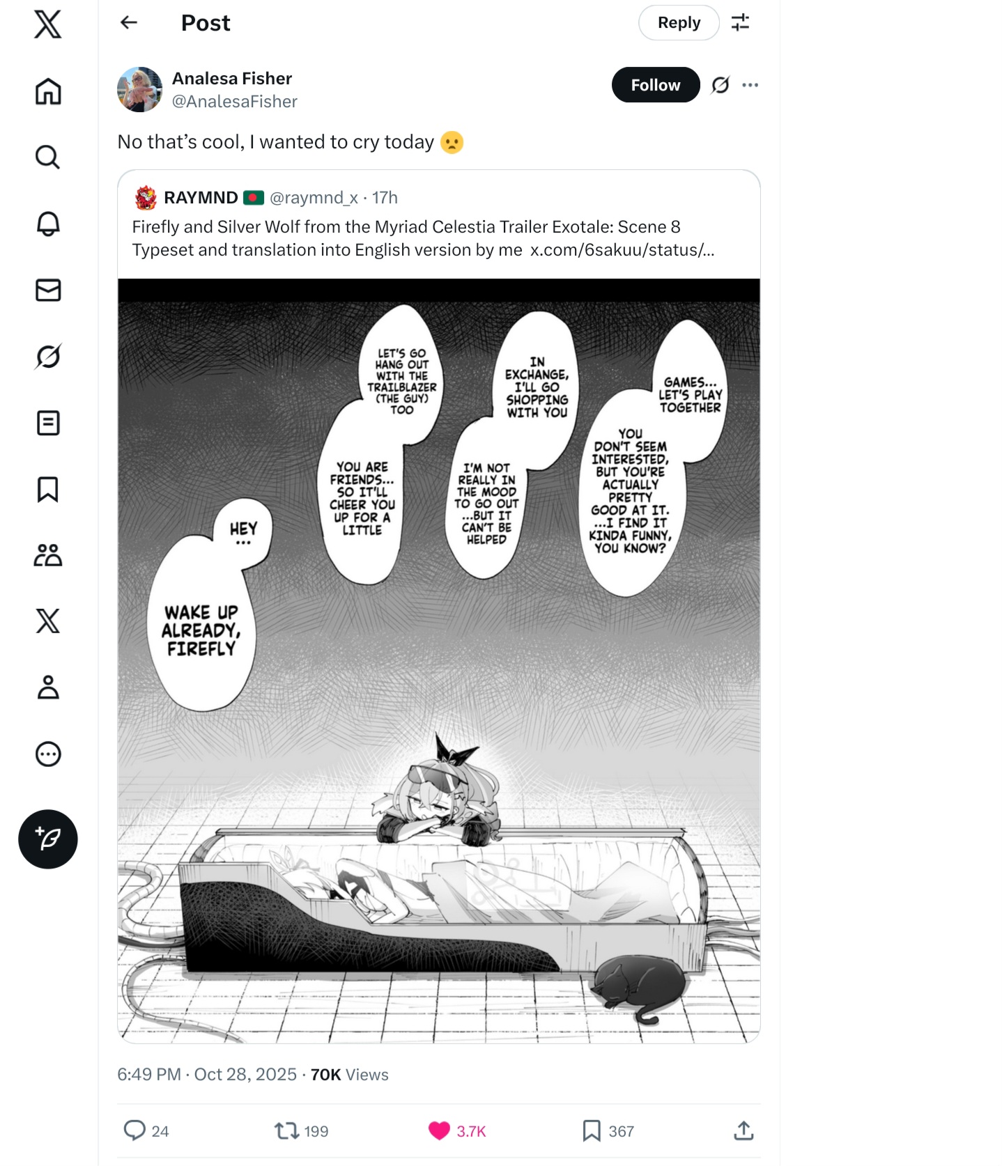 Previous: >>548598571>Version 3.8 "Memories are the Prelude to Dreams" Special Program will release on 2025/12/05 19:30 (UTC+8)https://www.youtube.com/watch?v=VrSInGzFFKs https://www.youtube.com/watch?v=fl5--WIcpCk >Download - https://hsr.hoyoverse.com/en-us/home>3.7 Preview Page - https://act.hoyoverse.com/puzzle/hkrpg/e20251024vesion_1316/index.html>Version 3.7 Trailer: "As Tomorrow Became Yesterday"https://www.youtube.com/watch?v=r4gljUbCzqAhttps://www.youtube.com/watch?v=-L1PxKwvJ74>Cyrene Character Trailer: "With You Once More"https://www.youtube.com/watch?v=CRAuK8T6Xishttps://www.youtube.com/watch?v=rtSkMbDs1Xw>Golden Epic Trailer: Farewell, Cyrenehttps://www.youtube.com/watch?v=Sn901sn5_B0https://www.youtube.com/watch?v=zHFGsd-KsX0>Animated Short: "Hello, World!"https://www.youtube.com/watch?v=LB_65-rOYYohttps://www.youtube.com/watch?v=_GG4BgkyRiY>Myriad Celestia Trailer — "Exotale: Scene 8"https://www.youtube.com/watch?v=x3bRer52asEhttps://www.youtube.com/watch?v=owFII5A3OfE>Current Character Banners: Cyrene, Phainon, Cipher, Mydei + Pela, Lynx, Moze - https://www.hoyolab.com/article/42482837>New Drip Marketing:>The Dahlia (5* Fire Nihility) - https://www.hoyolab.com/article/41861857>Redeemable Codes - https://hsr.hoyoverse.com/giftJS2QEA3SDHFKSTARRAILGIFTSTORYOFLOVEOMEGA>/hsrg/ Tools & Resourceshttps://rentry.org/hsrg-resources-14>/hsrg/ Thread Templatehttps://rentry.org/hsrg-thread-template-14