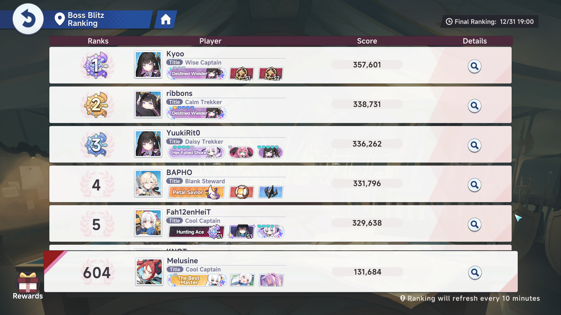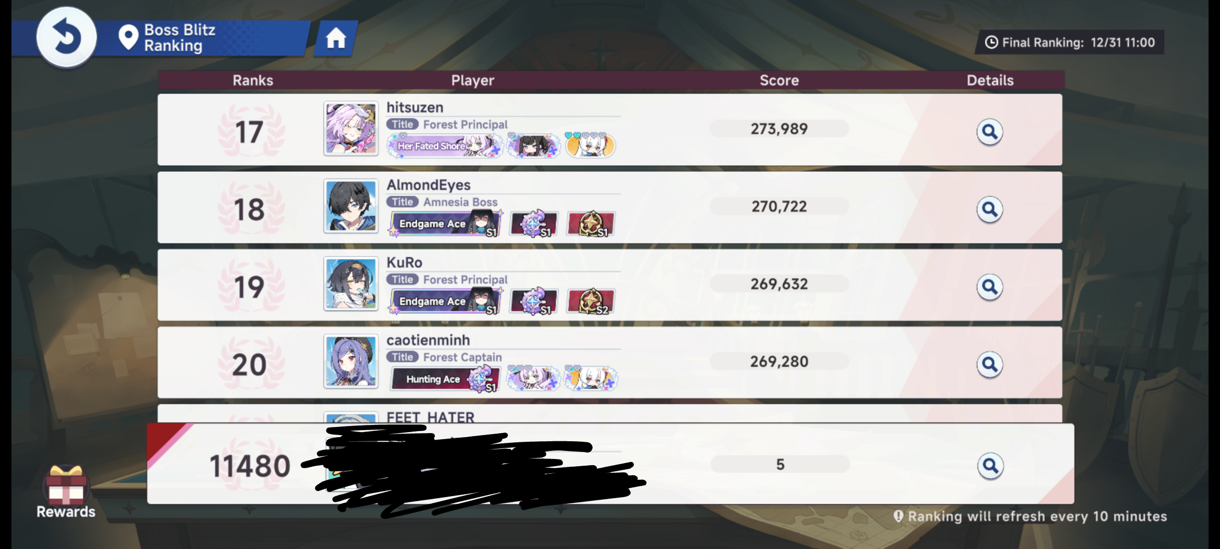 Barely top 400 at the moment with 134k. Surely this will hold for plat.It looks like Yostar started exponentially scaling defense for these bosses as you do more damage, so even gigawhales can't do more than about 300k max. Because the scores are no longer as linear it makes it hard to judge damage, but I assume this is an anti-Shia measure so that you can't stack up 4x the score on one side with such harsh diminishing returns for damage