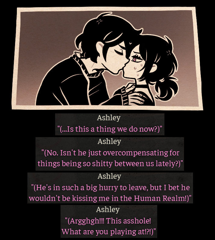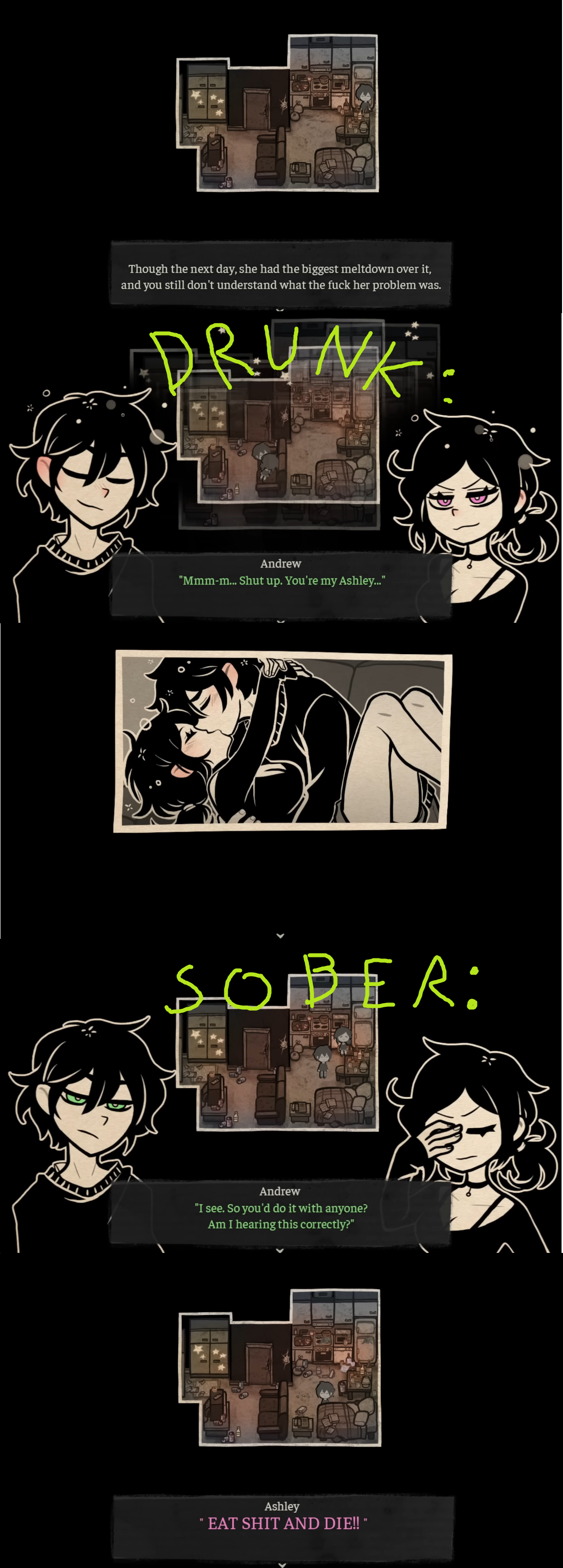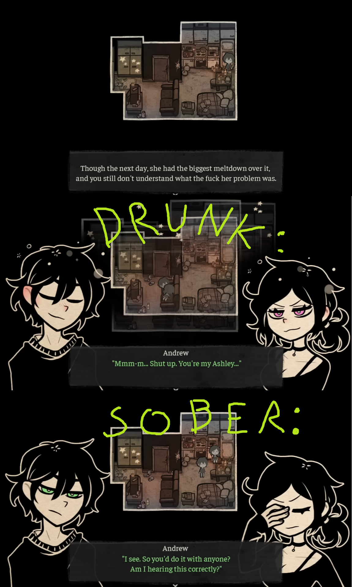 >>548689471>possessive Yeah, but a lot of people assumed he was just being a protective big bro still treating Ashley like a kid. Before Coffin was known as 'the incest game' people didn't automatically look at all their interactions through a relationship lens, especially since Ashley clarified in room 302 that she's only sabotaging Andrew's love life back then Nemlei made it seem like he was sleeping around a lot because she needs him in her life as a father figure. There was nothing incestuous about their relationship before episode 2.